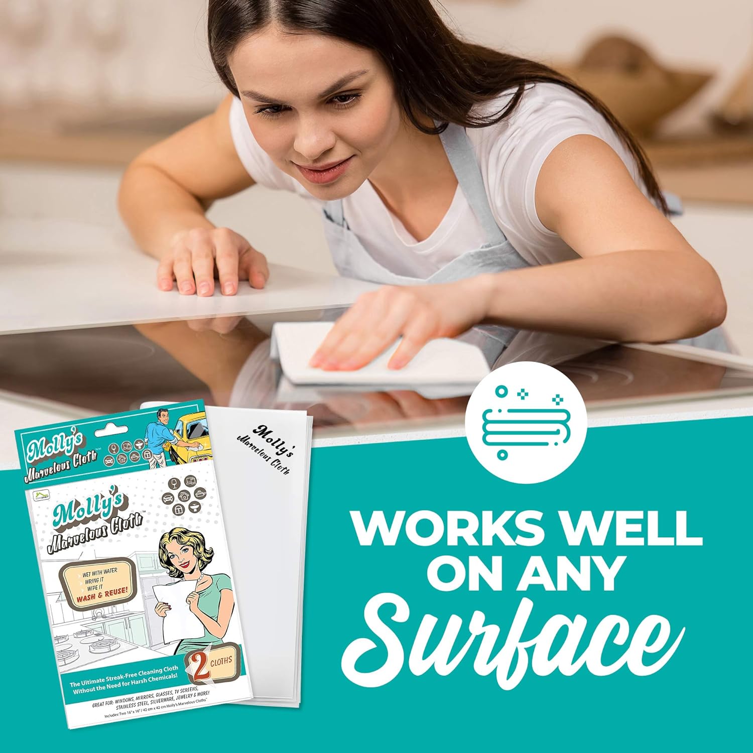 Molly's Marvelous Cloth, Streak-Free, Lint-Free Microfiber Cleaning Cloth, Polishing Cloth for Glass, Stainless Steel, Use for Kitchen, Bath, Cars, Detailing, Reusable(17" by 16") (2pk, White)