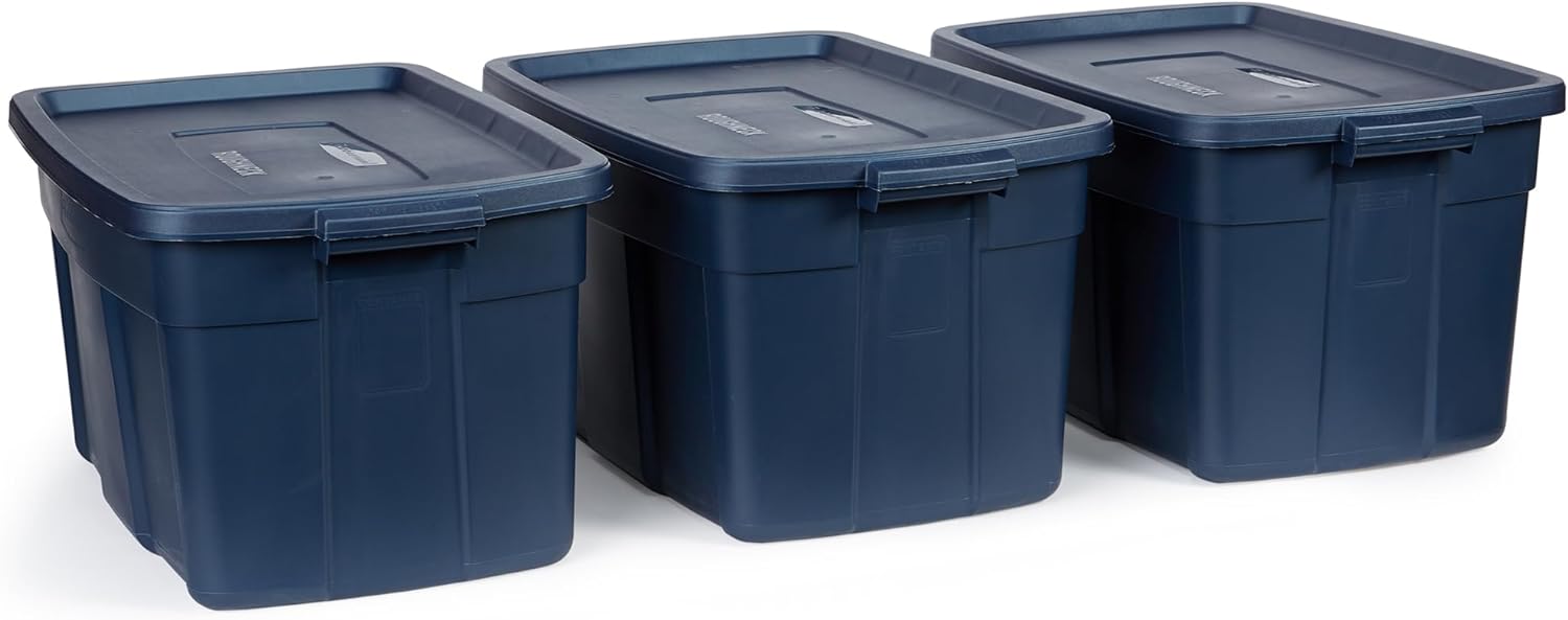 Rubbermaid Roughneck Tote 31 Gal, 3 Pack, Made in USA, Dark Indigo Metallic, Rugged Plastic Stackable Storage Bins with Lids and Handles