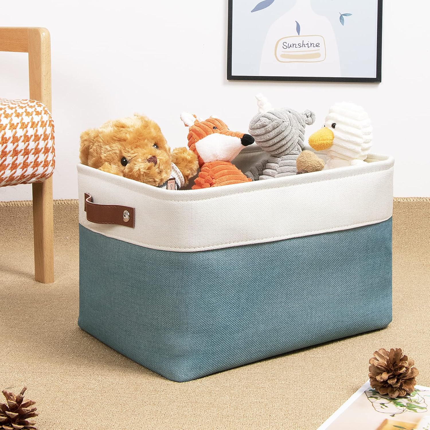 DULLEMELO Fabric Storage Basket for Shelves/Closets, Collapsible Rectangle Basket for Organizing Clothes, Toys, Towels, Books, Laundry, Nursery, Dog Toy Basket Empty (White&Teal)