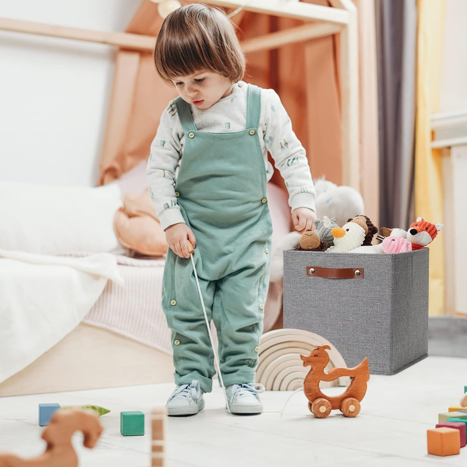 - 【Material】These cube storage bins are constructed of sturdy and attractive linen & cardboard with linen interior lining. The sturdy leather handles make it easy to carry or pull off and out of shelves.