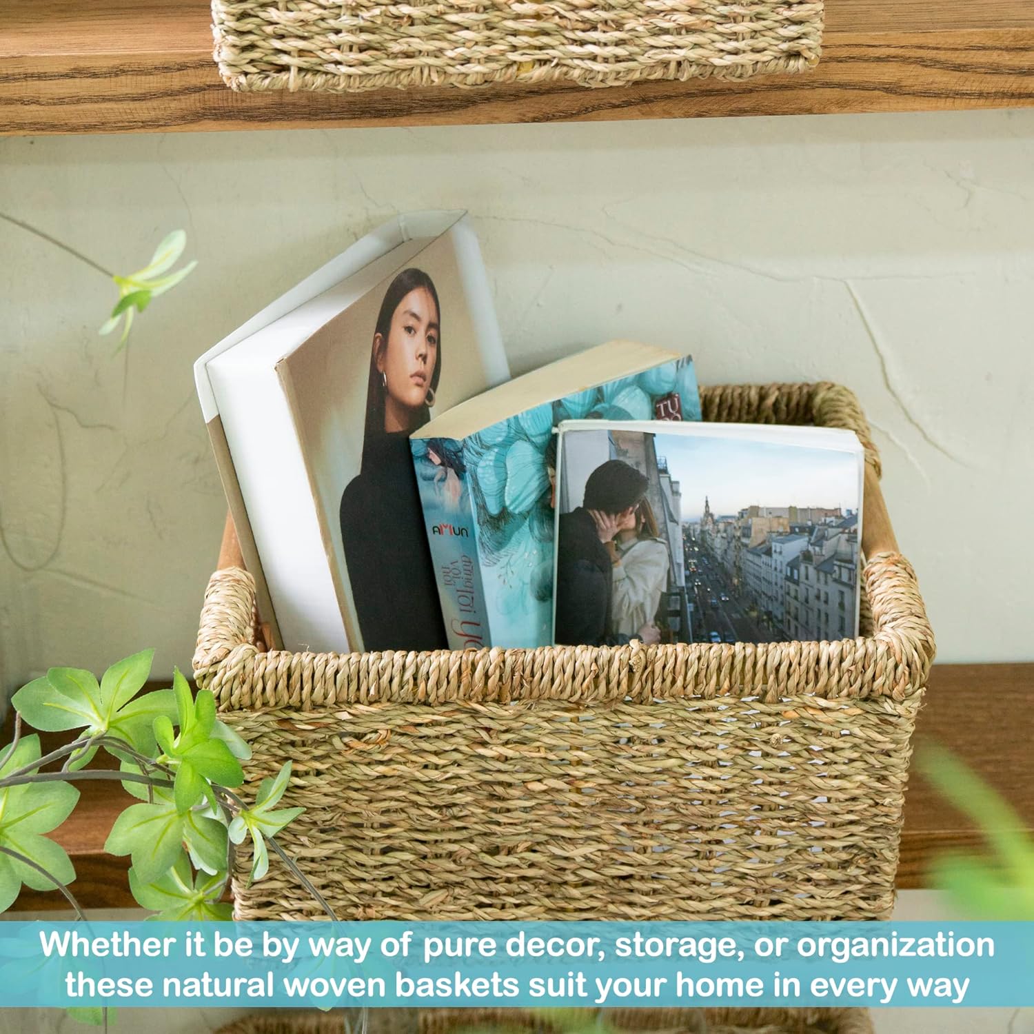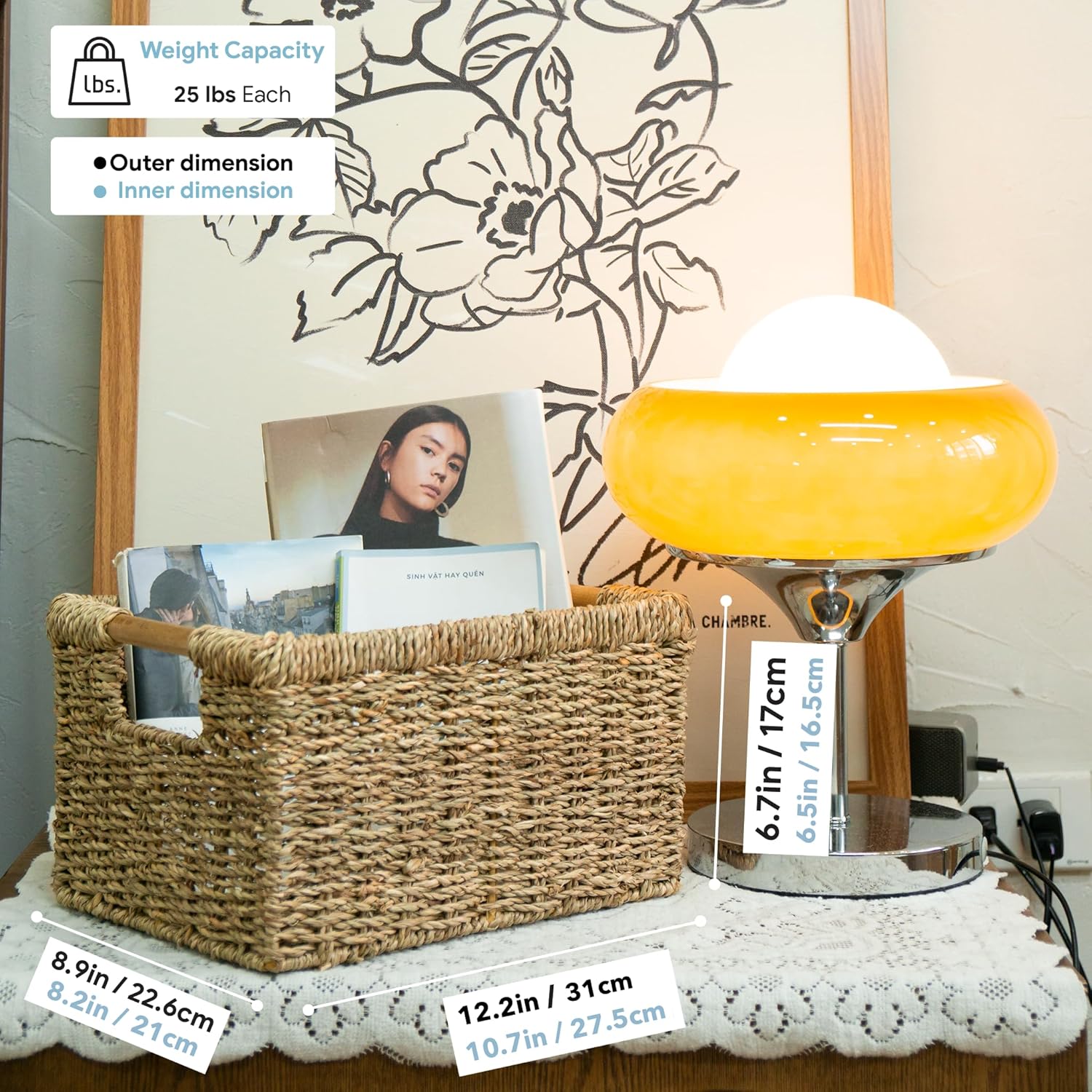 Natural Seagrass Basket with Wooden Handle, Medium Rectuangular Wicker Basket for Living Room 12.2 x 8.9 x 6.7 inches - 3 Pack
