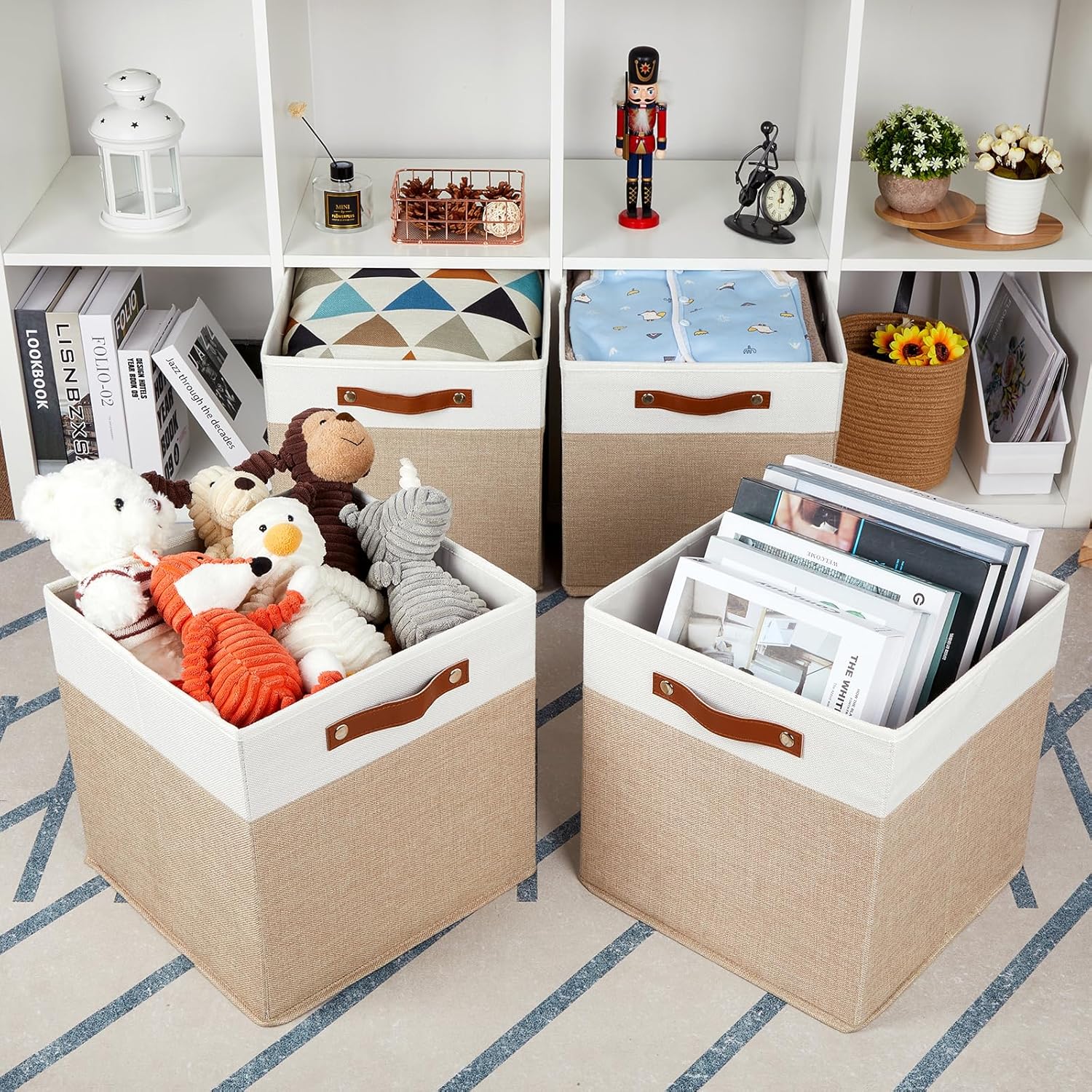 HNZIGE Fabric Baskets for Organizing 13x13 Storage Cubes, Set of 4 Fabric Foldable Canvas Storage Bins for Shelves, Cloth Storage Bins for Cube Organizers Toy Nursery Closet Bedroom?Beige&White?
