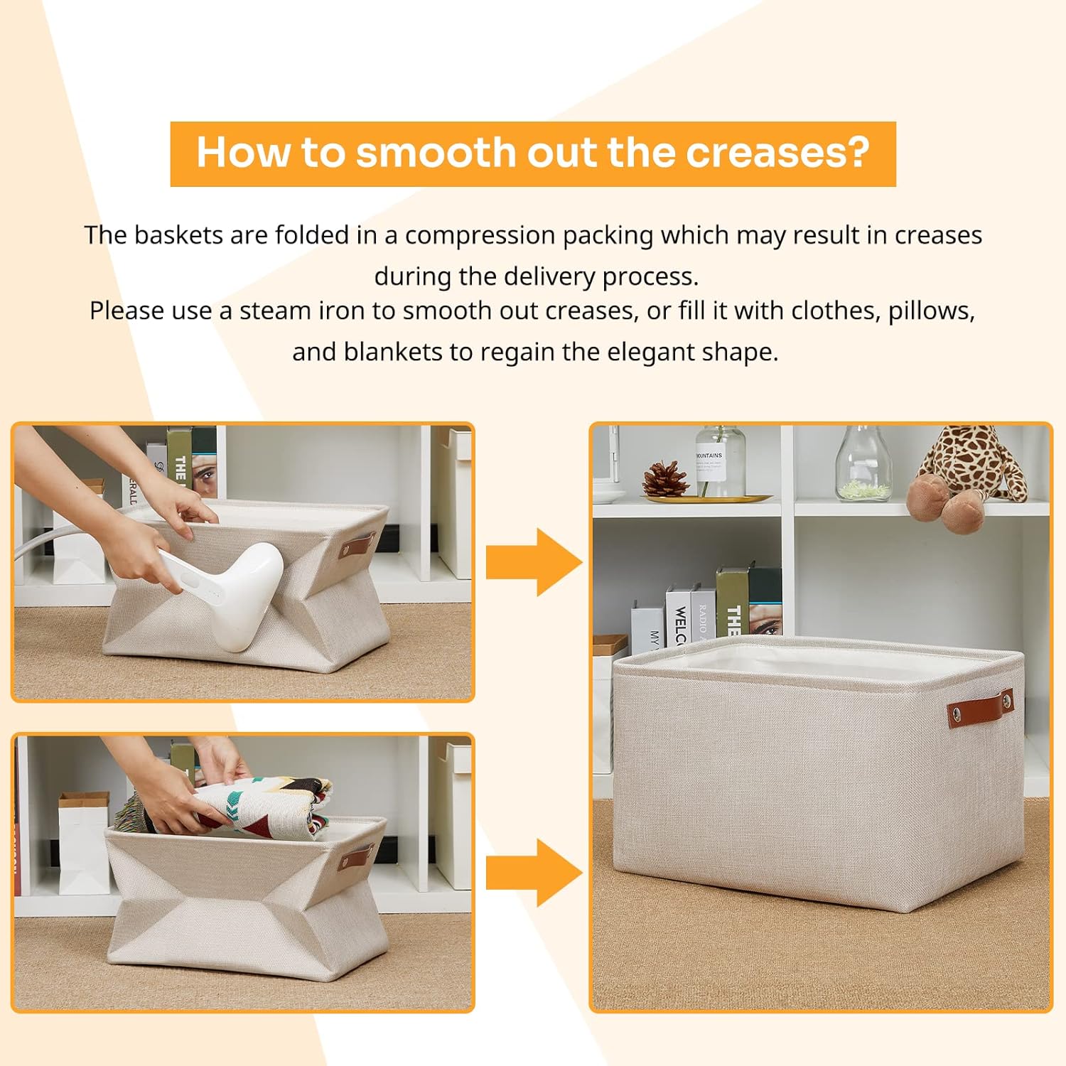 - 【EASY TO CARE】The medium storage basket is sturdy and has no odor. Built to last these bins are reinforced with an O-ring on the top to give shape and structure so they are not machine washable. Due to lined with a thin linen fabric, they are easy to clean, just need to wipe with a damp sponge or cloth.