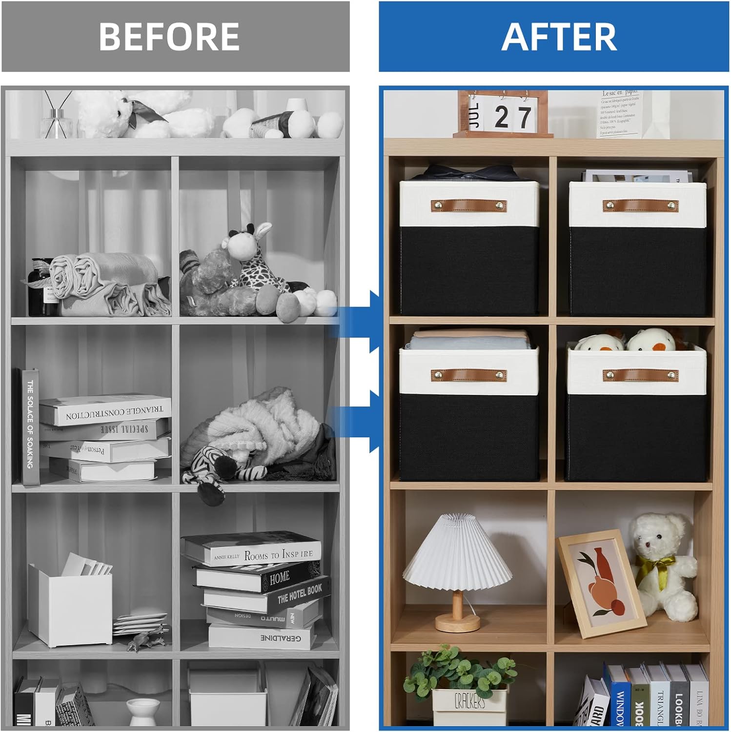 Temary 11 inch Cube Storage Bin 4 Pack Fabric Storage Cubes for Home, Fabric Storage Bin Storage Cube Bins with Leather Handles(White&Black)