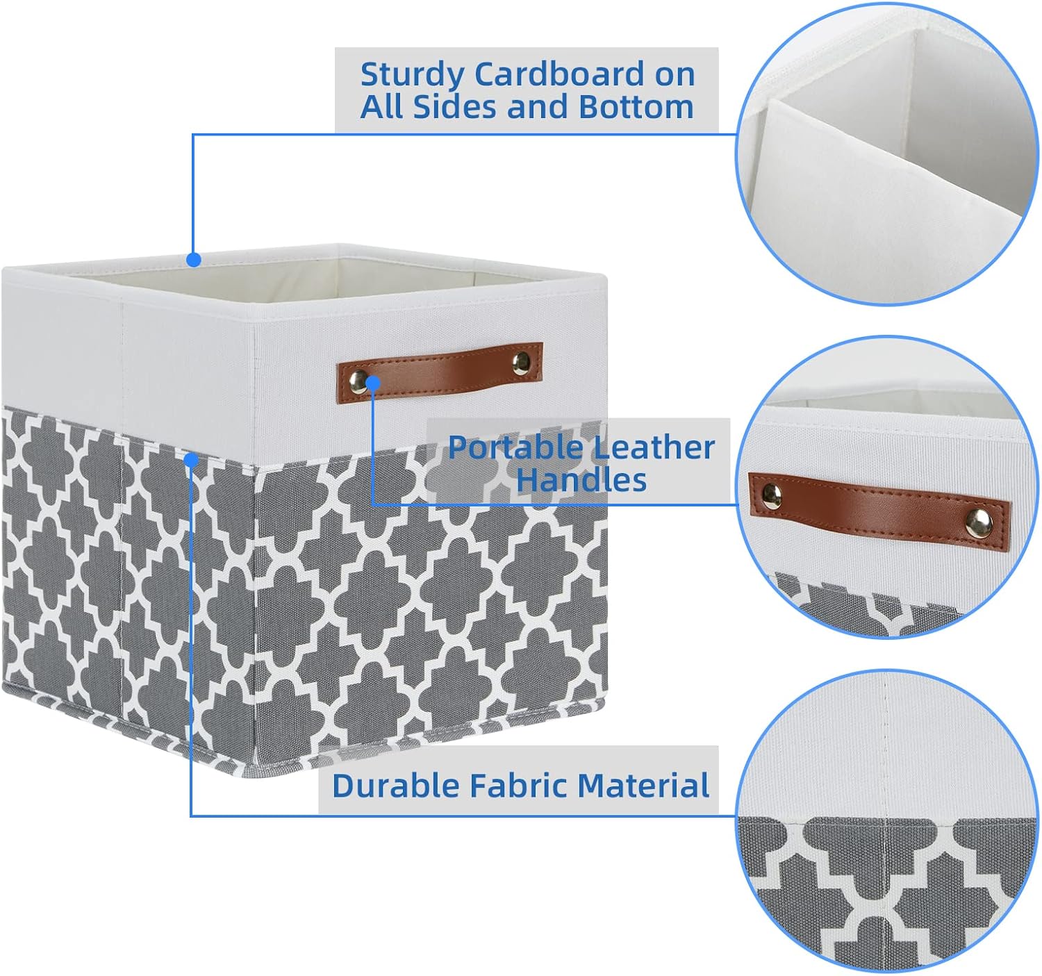 Temary 11x11x11 Cube Storage Bins Cube Organizer Bins 4 Pack Canvas Storage Bin for Home, Cube Storage Basket with Leather Handles(Grey Lattice)