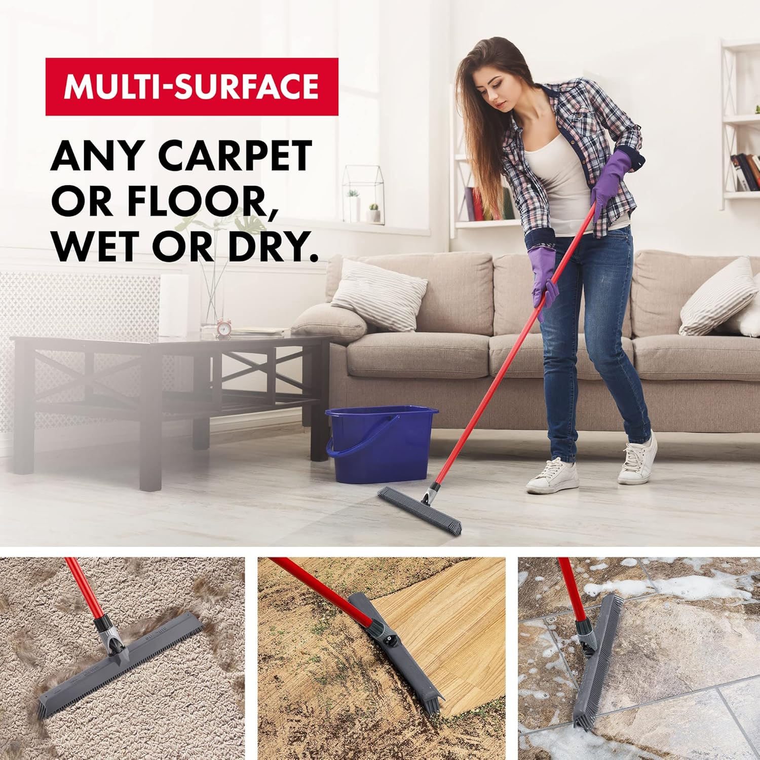 2-in-1 Silicone Rubber Broom Carpet Rake and Squeegee - Swivel Pet Hair Removal Broom with Long Handle - Slanted Side Bristles for Corners - Multipurpose Rubber Broom for Carpet, Hardwood Floor, Tile
