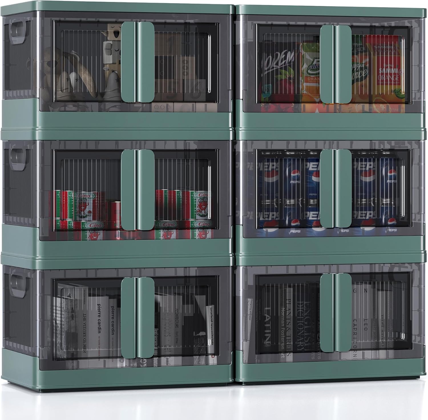 8.4Gal Collapsible Storage Bins with Lids & Wheels - 6 Pack Stackable with Doors, Heavy-Duty Plastic Containers for Home/Office, Green