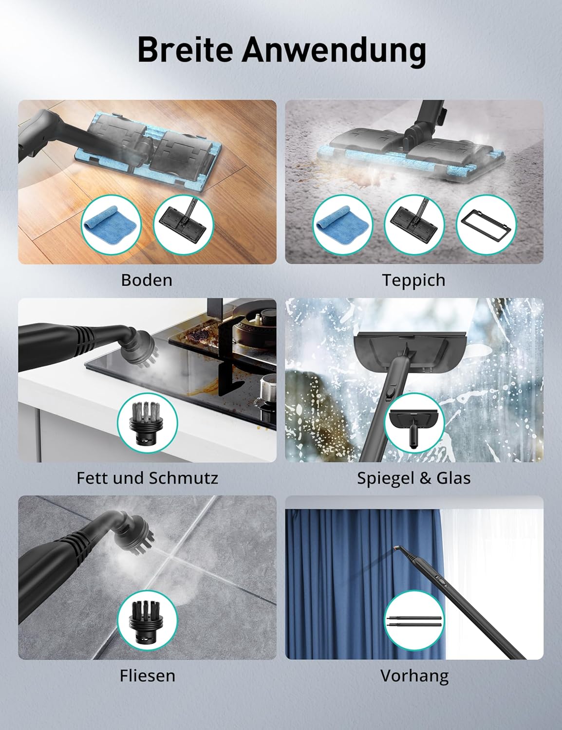 • 【21 Versatile Accessories】 The steam cleaner for car and home use Including a floor brush, an ironing brush, a glass brush, 3 Nylon round brushes, 3 stainless steel brushes, 2 extension tubes, a big nozzle, a towel floor brush, an ironing towel, a carpet glider, a pair of gloves, a squeegee, a measuring cup, a funnel, a piece of cleaning wipe, and a storage bag, this carpet steam cleaner handles different cleaning tasks and is perfect for car, office, bedroom and home use