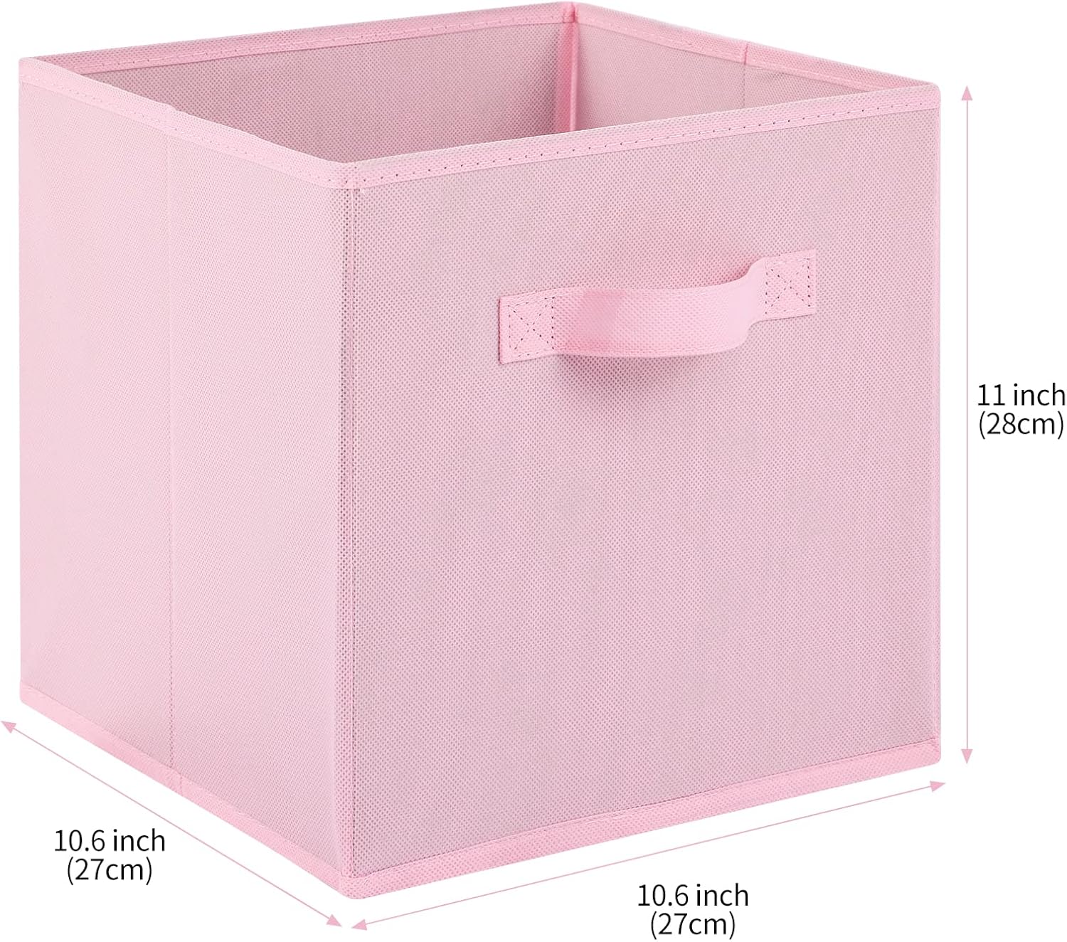 - Strong Quality: The size of the storage box is 10.6" L x 10.6" W x 11" H. The inside is 2mm thickness cardboard, and the outside is 100% non-woven fabric to ensure that they stand upright, and with strong handle in the front of each box for easy grasping and transportation.