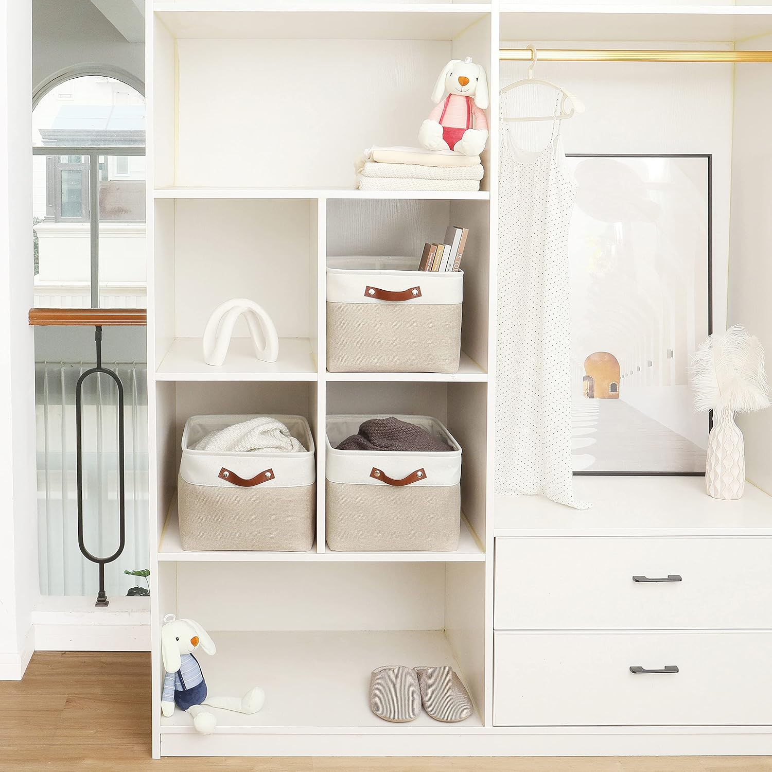 - Decorative Fabric and Vegan Leather – These versatile storage baskets for organizing your everyday life are made with a thick, high-quality fabric and fitted with leather handles to add a stylish touch to a living room, bedroom, office, or personal space.