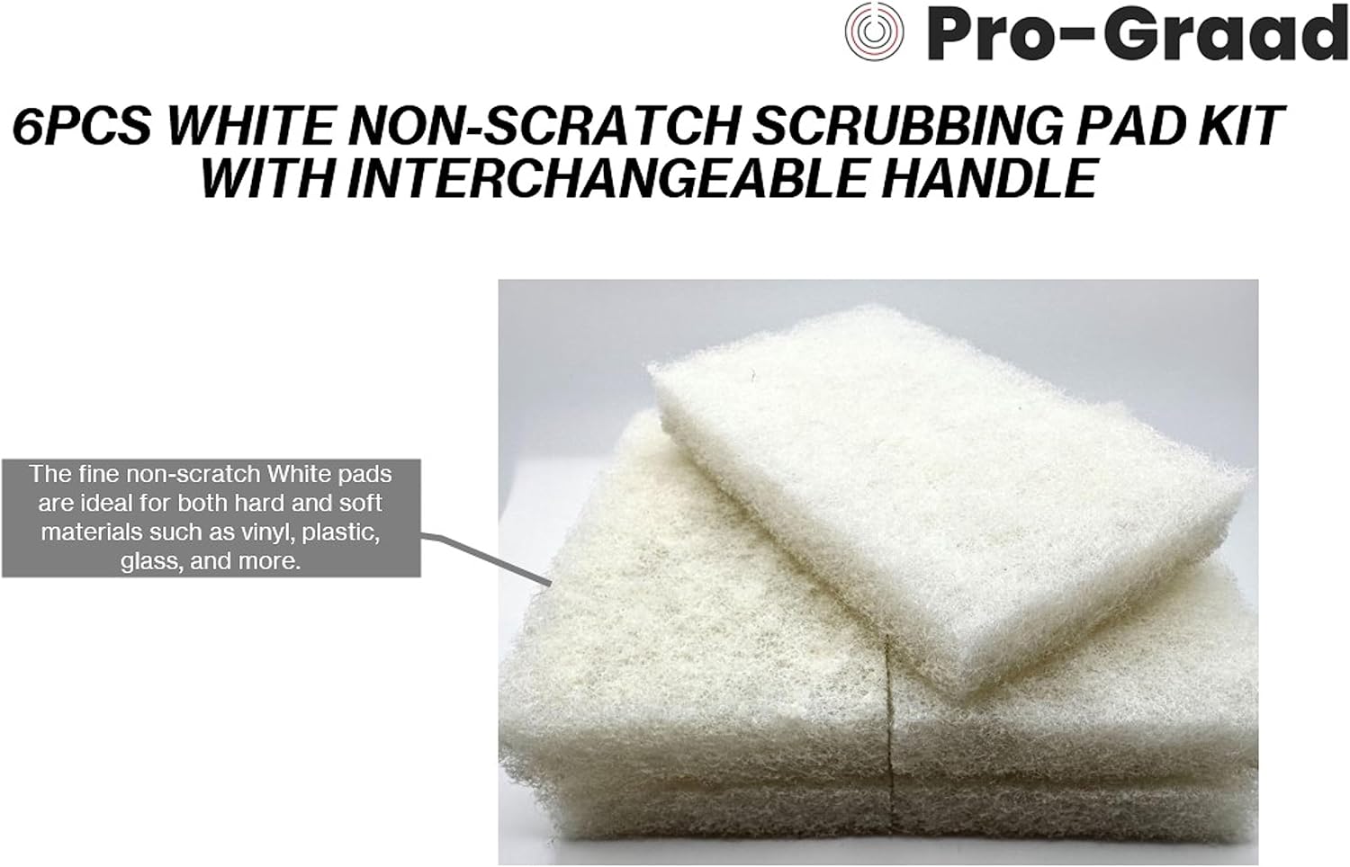 • The Pro-Graad 6 piece kit includes 5x White Non-Scratch Cleaning Scrubber Pads and 1x Interchangeable Handle. This cleaning solution is perfect for a variety of surfaces and cleaning occasions. It is especially suitable for cleaning boats, pools & hot tubs, fiberglass tubs, showers, shower doors, ceramic tiles, and even wooden floors.