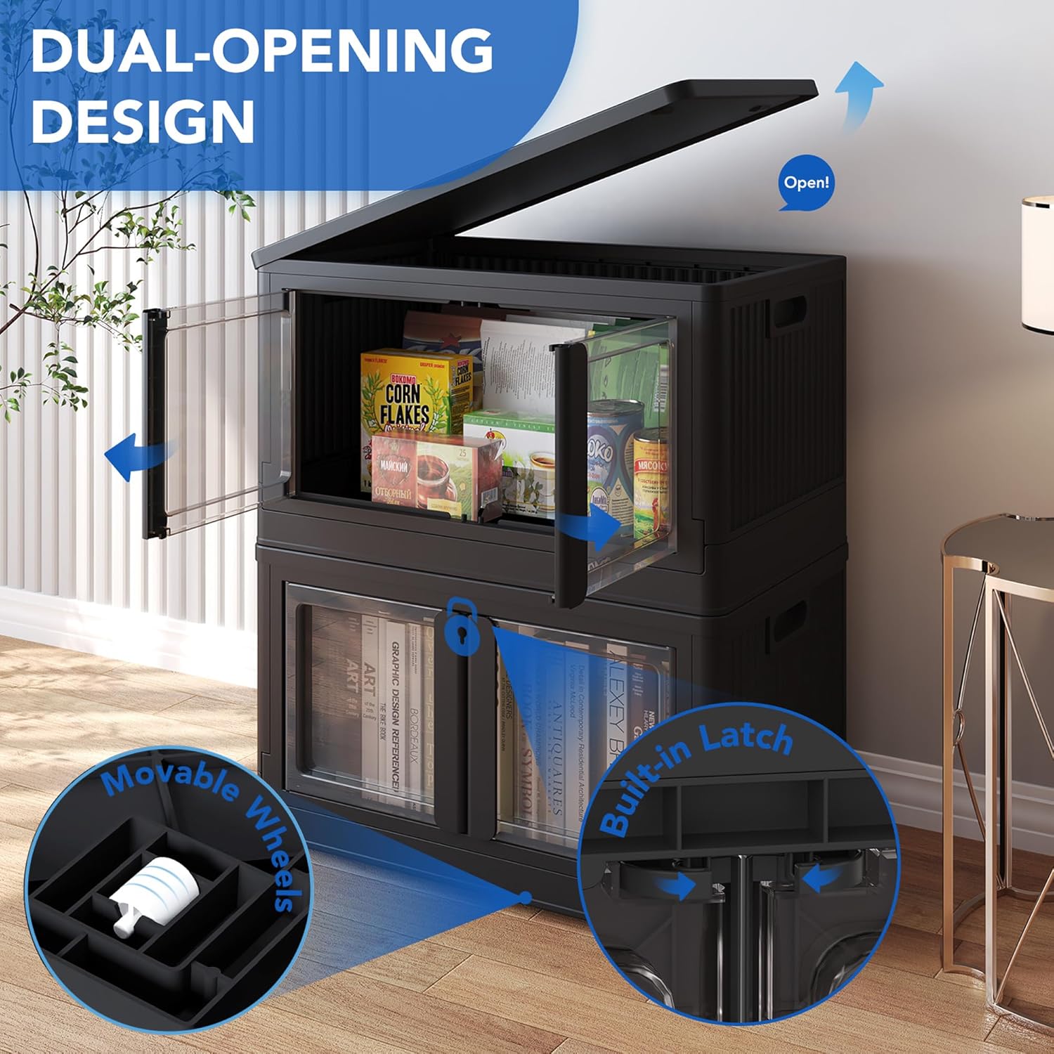 - Dual-Opening Design: You can choose to open the top lid to access items or the front door for easier retrieval. The front door is also transparent, allowing for easy identification of storage contents. Plus, the front door is equipped with a built-in latch that can be locked and unlocked by simply turning the handle.