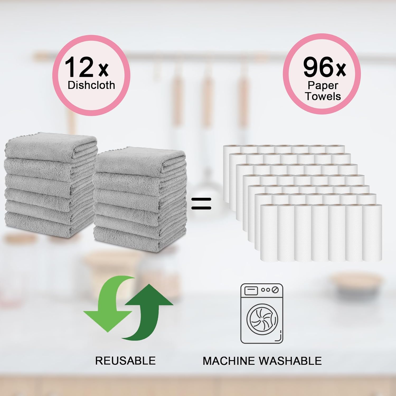 kimteny Kitchen Cloth Dish Towels, 13x28 Inches Premium Dishcloths, Super Absorbent Coral Velvet Microfiber Cleaning Cloths, Fast Drying Rags for Washing Dishes (13x28-12 Pack, Grey)