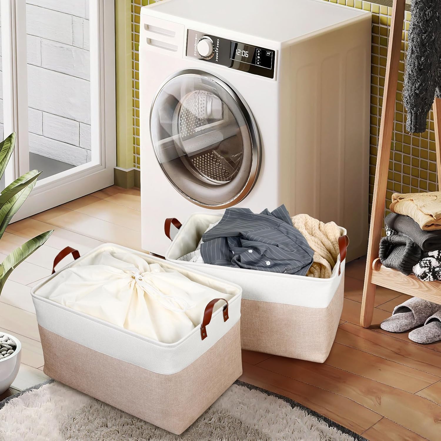 DULLEMELO 70L Extra Large Storage Bin, 22" x 15" x 13" Oversized Storage Basket, Collapsible Storage Box, Fabric Clothes Toys Blanket Basket for Shelves, Laundry, Nursery (White&Khaki)