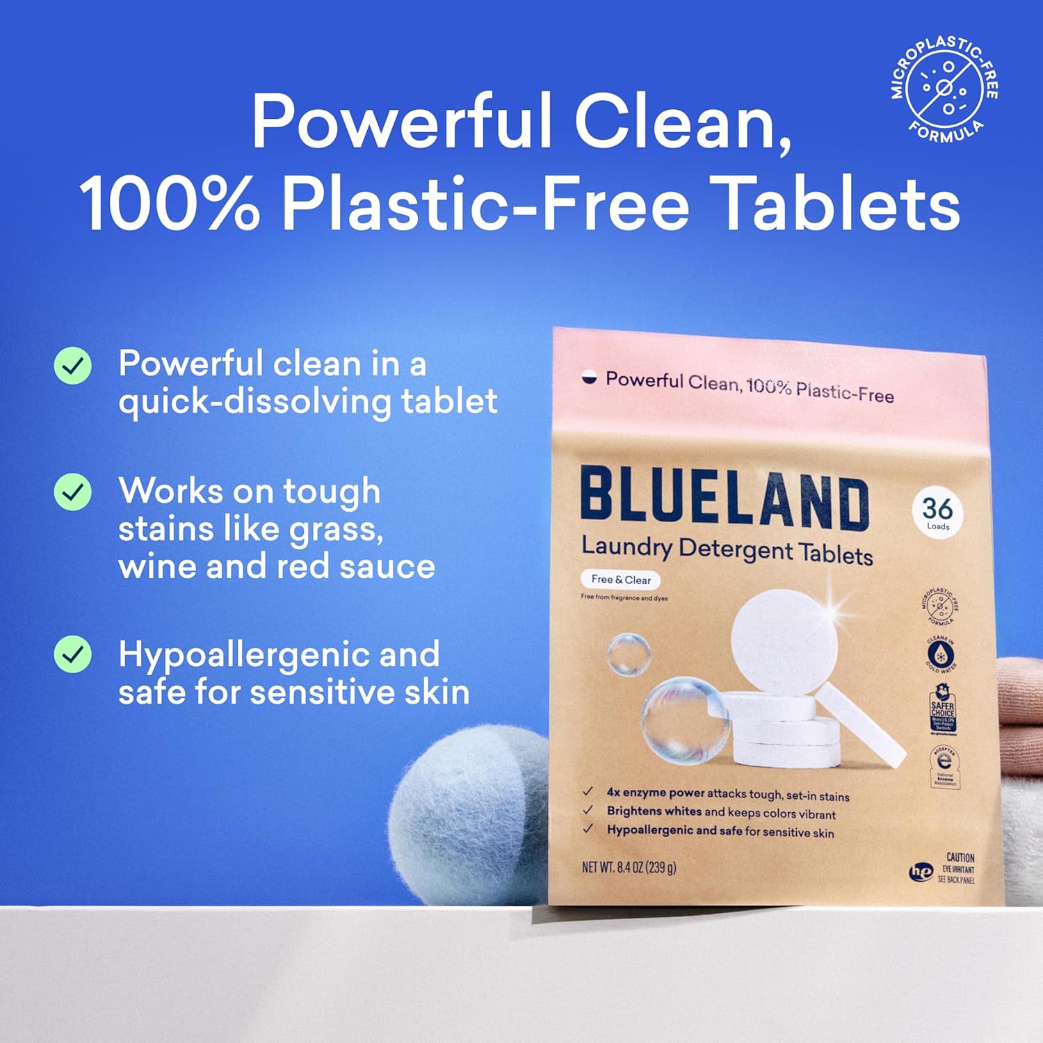 - PLASTIC-FREE, ECO-FRIENDLY LAUNDRY TABLETS. Tough on stains, gentle on the planet. Our 100% plastic-free tablet is tried, tested, and proven to lift the toughest stains—from grass and coffee to food and makeup—without any harsh chemicals. Formulated safe for family, healthier for planet, and powerfully effective so you can ditch plastic pods and sheets for a higher standard of clean.