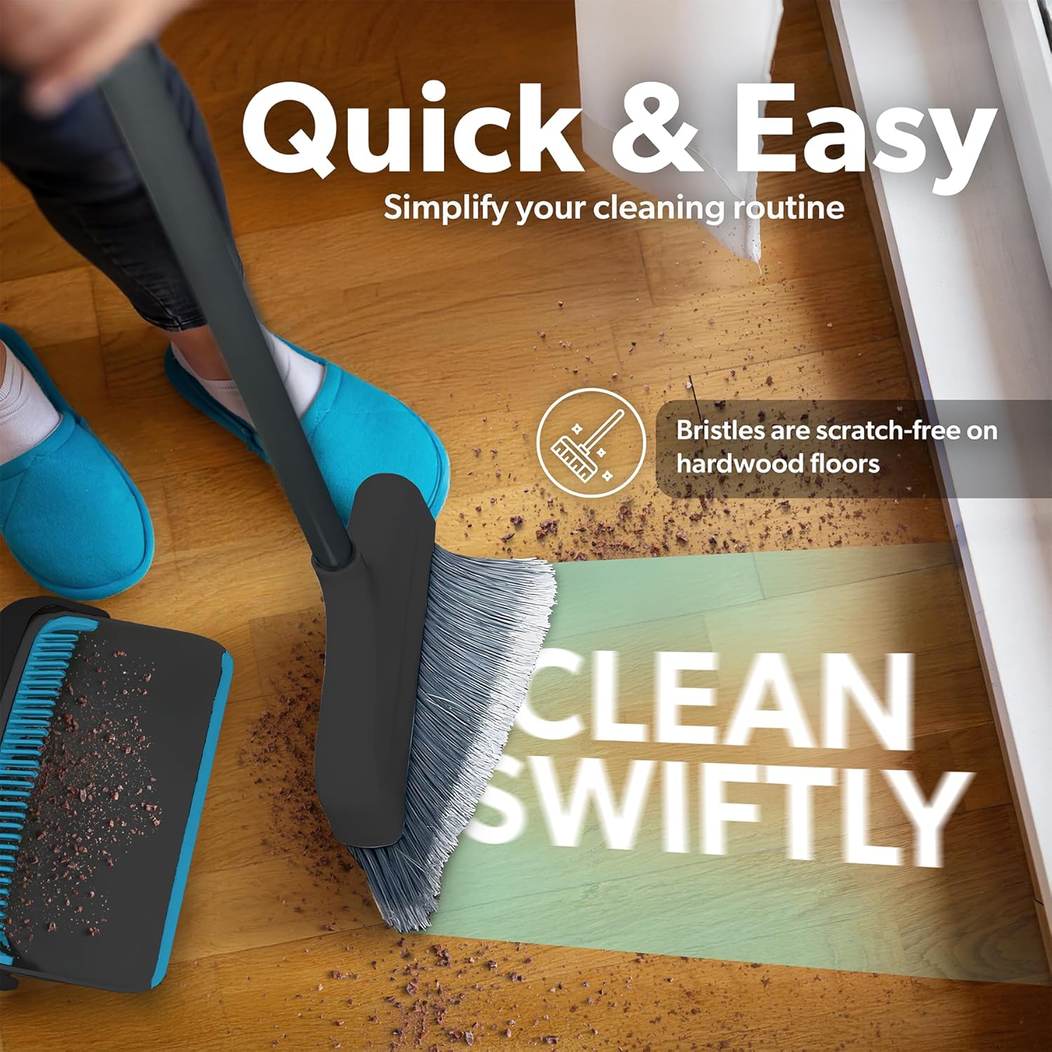 • Self Cleaning Comb Design - Sturdy teeth at the top of the dustpan comb the broom, when it collects hair/dust/lint which usually gets tangled into the bristles. Otherwise, you would need to remove them manually - not the most pleasant experience. The dustpan has a rubber lip and seamlessly sticks to the floor. It picks up everything, including the smallest particles, in the first swoop, so you will finally spend less time cleaning - more time living!