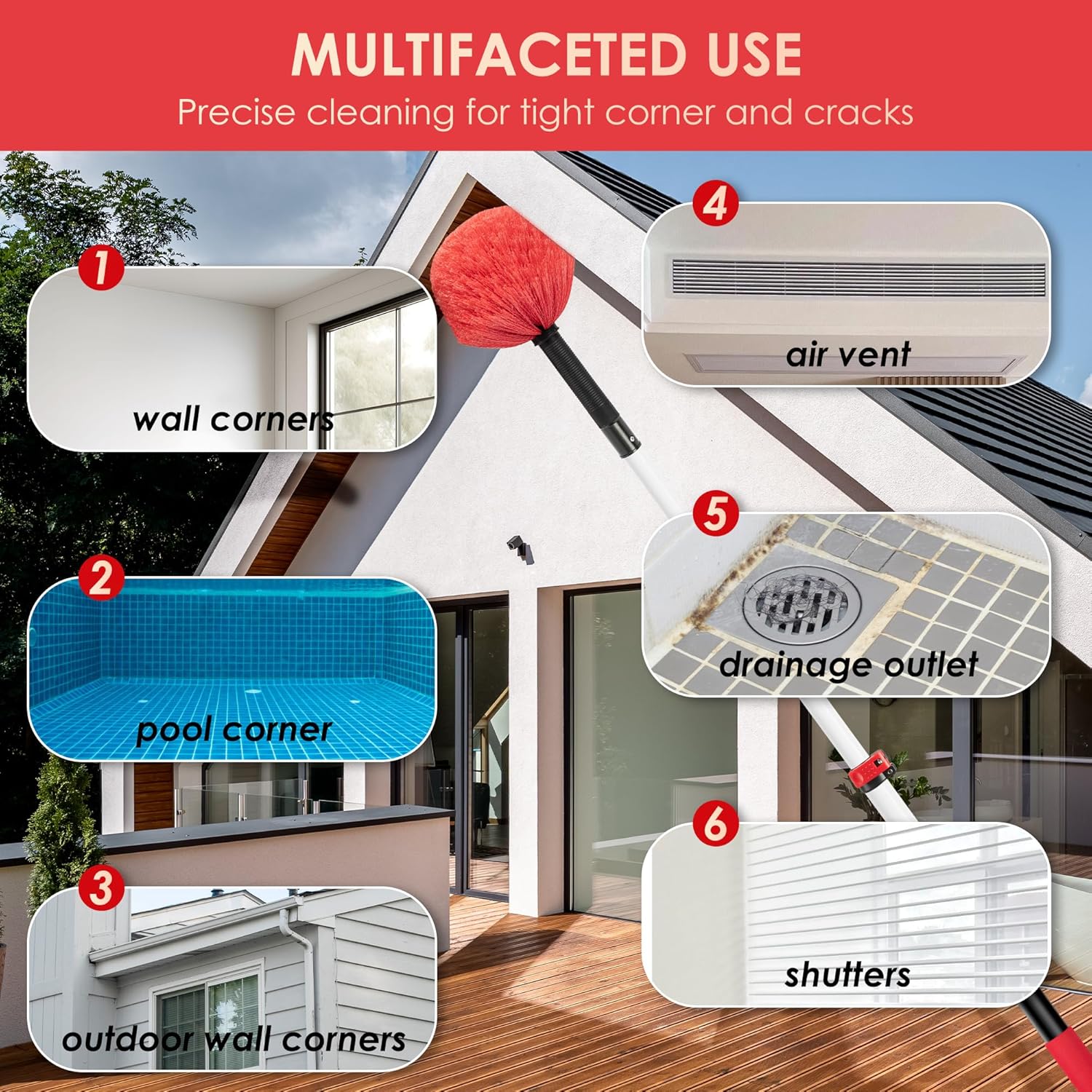 - Multi-Scenario Usage: Lightweight and easy-to-use cobweb duster with extension pole, perfect for cleaning high, hard-to-reach spots inside or outside; proper shape and soft bristles remove dust and cobweb to protect surfaces from scratches.