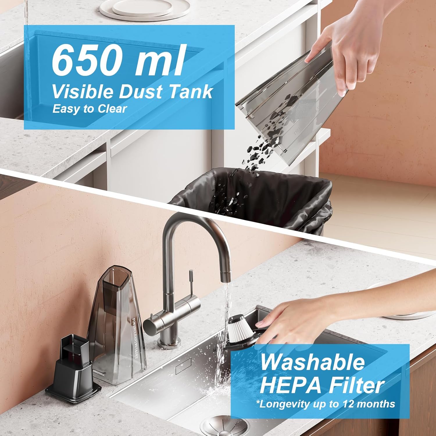 - Large Dust Bin + Washable HEPA Filter - The 650 ml large dust collection box can hold more dust and can be easily emptied with just a press of a button. Cordless handheld vacuum has a three-layer HEPA filtration system that can remove up to 99.99% of dust particles. It has a longer service life than traditional filters and can remove dust with clean water