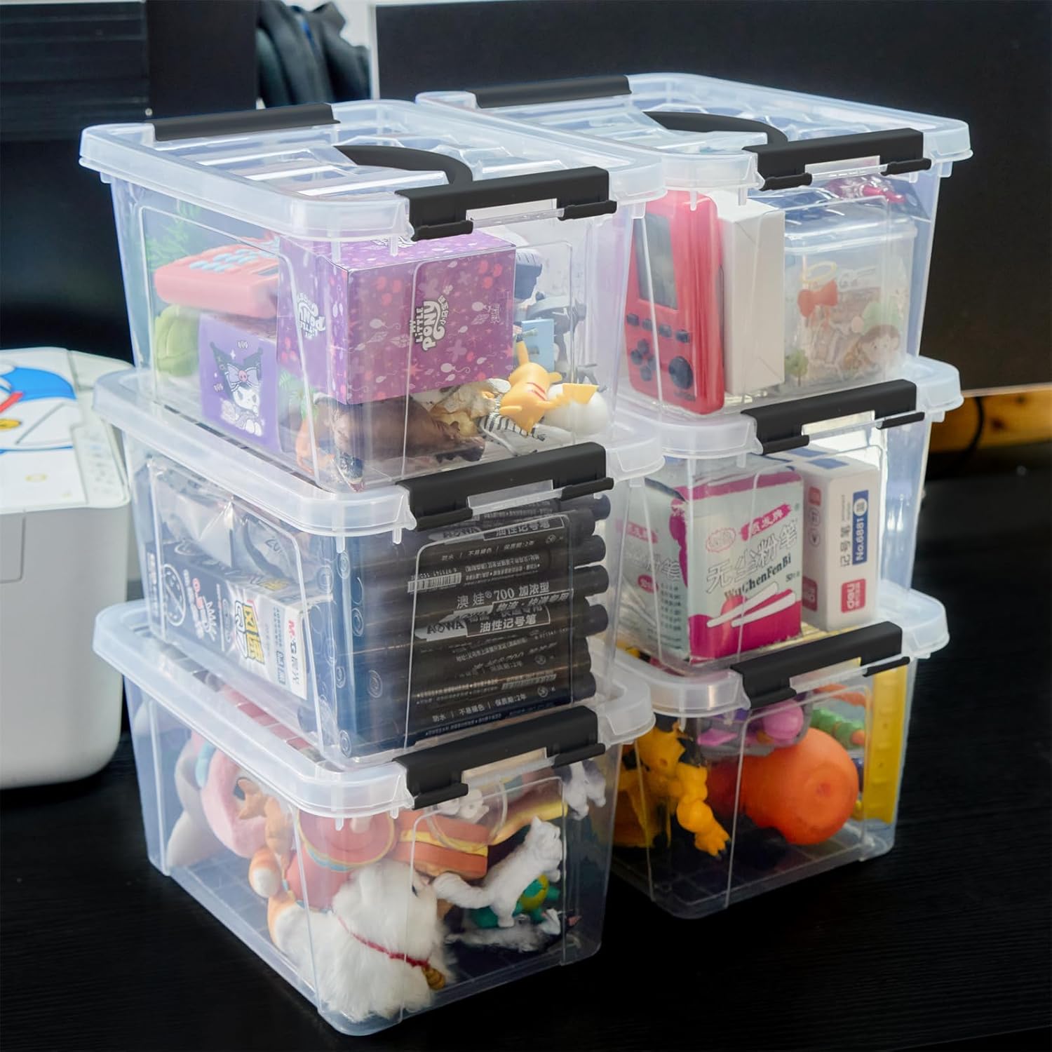 6 Quart Plastic Stackable Storage Latch Bins,Clear Latching Box with Handle and Lid,Pack of 6 (Black Handle)