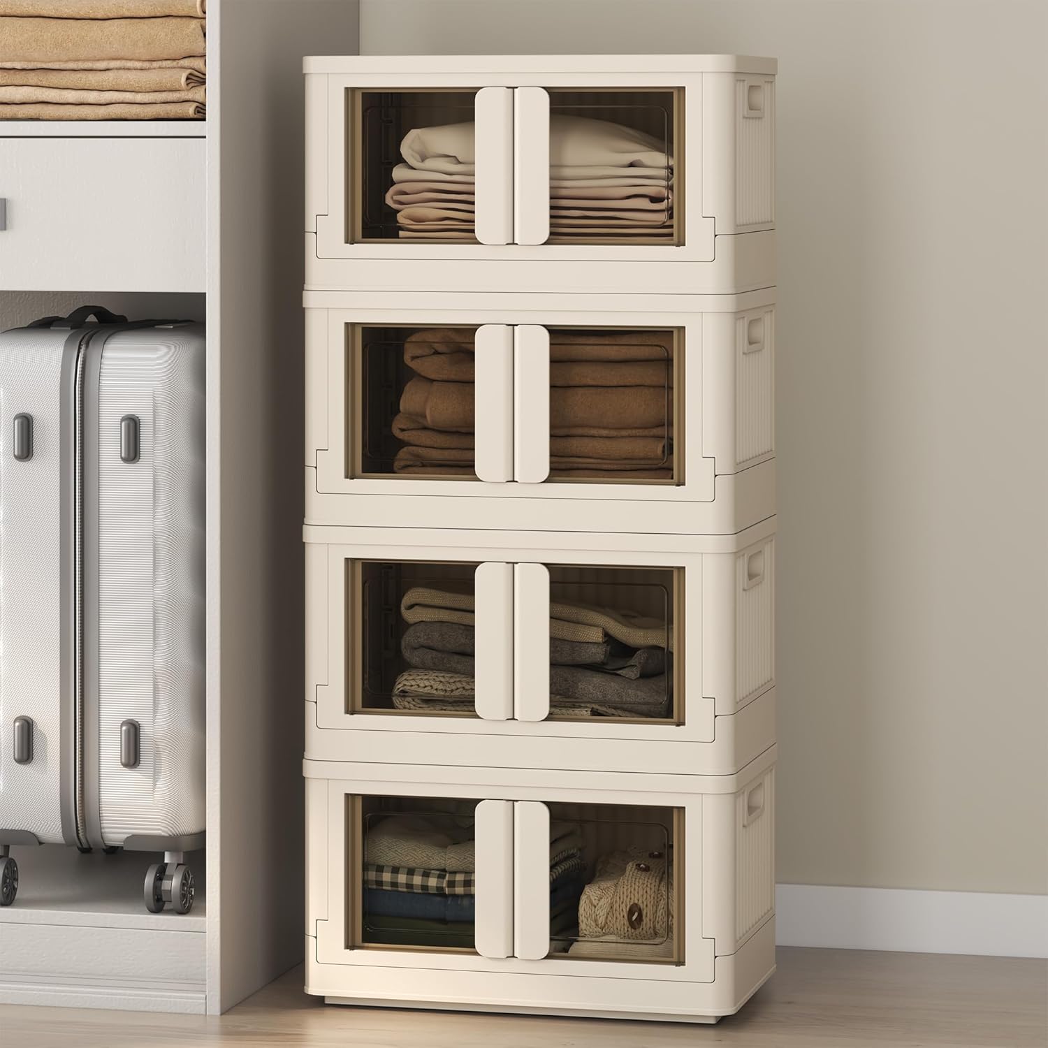 FLEXIMOUNTS 150 QT Stackable Storage Bins With Lids, Collapsible Plastic Storage Bins, Closet Organizers and Storage Containers with Doors and Built-in Wheels For Home, 4 Pack Cubes, Milky White