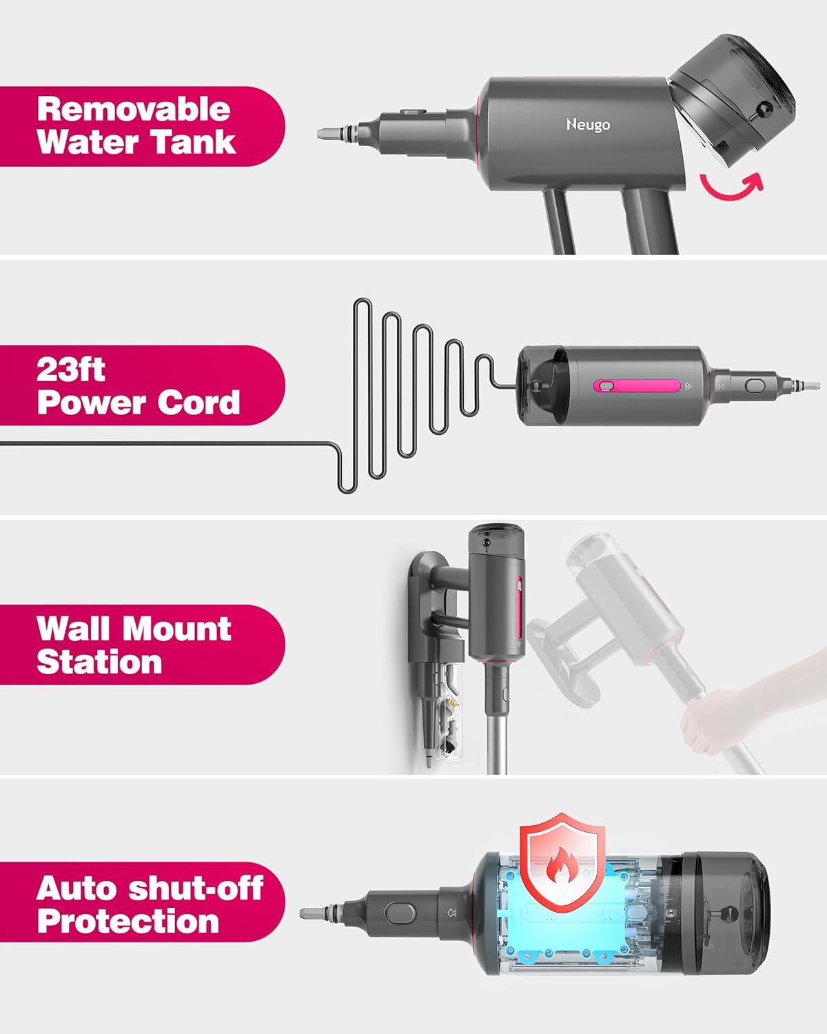 • 23 ft Ultra Long Cord & Detachable Large Water Tank: Allowing you to easily clean large areas without the need for frequent refills or changing power outlets. The detachable water tank offers convenience and easy refilling