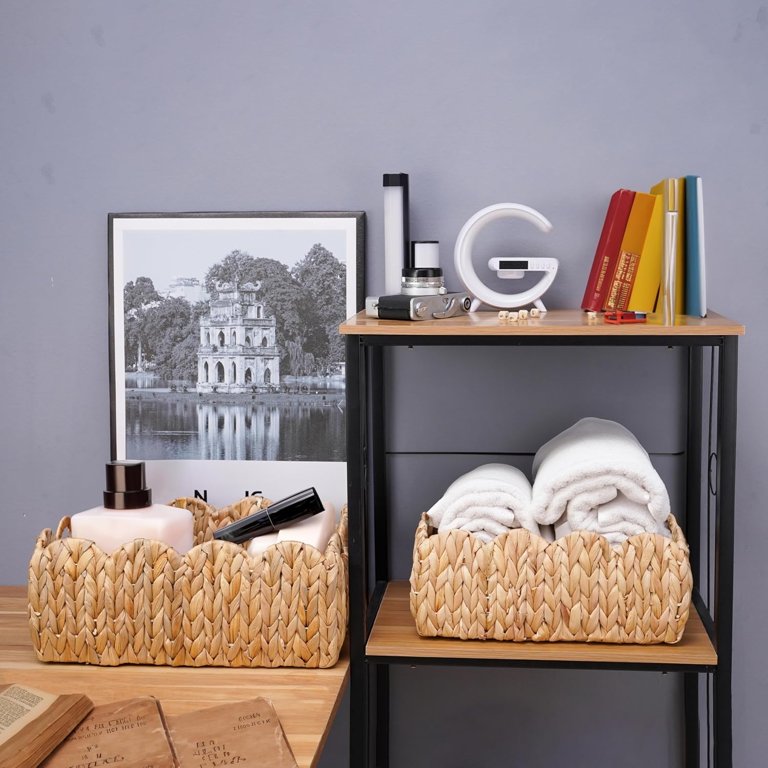 Set of 2 Scalloped Edge Wicker Storage Basket with Built-in Handles, Rectangle Water Hyacinth Basket for Organizing, Decorative Woven Rattan Basket for Shelf, Nursery Room