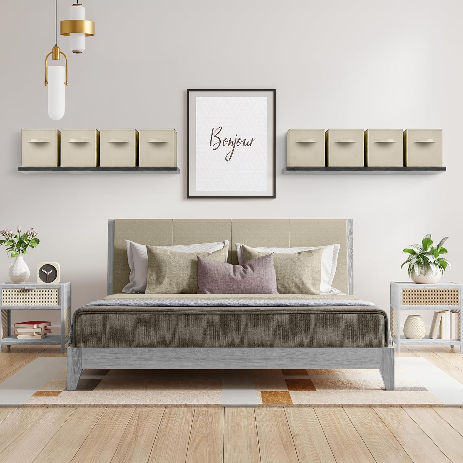 - Design Details: Made of nonwoven polypropylene and cardboard. Fabric storage bins measure approximately 13” L x 13” W x 13” H