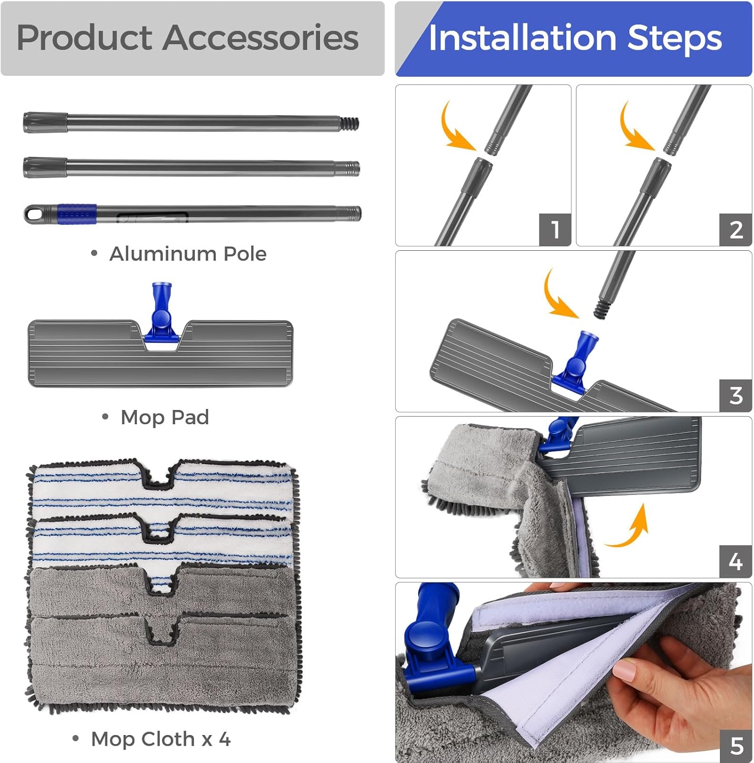 - [360° Rotating Mop Head] The microfiber mop can be flexibly rotated 360 degrees, and the Velcro design can better grip the hardwood floor mop pad, so that you can effortlessly wipe up all the spaces in the house, even some hard-to-reach corners.