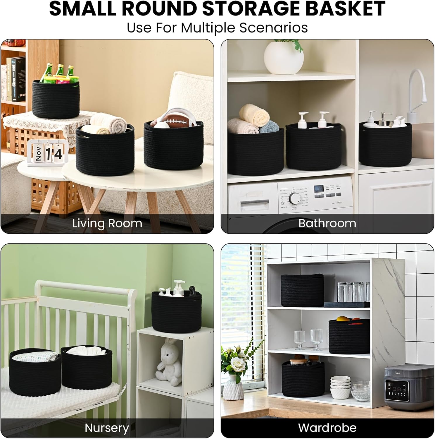Small Black Baskets for Organizing, Storage Baskets for Shelves, Small Woven Basket for Storage, Cute Basket for Gifts, Mini Cotton Rope Baskets, 9.7"×9.7"×7" (3 Packs) Black
