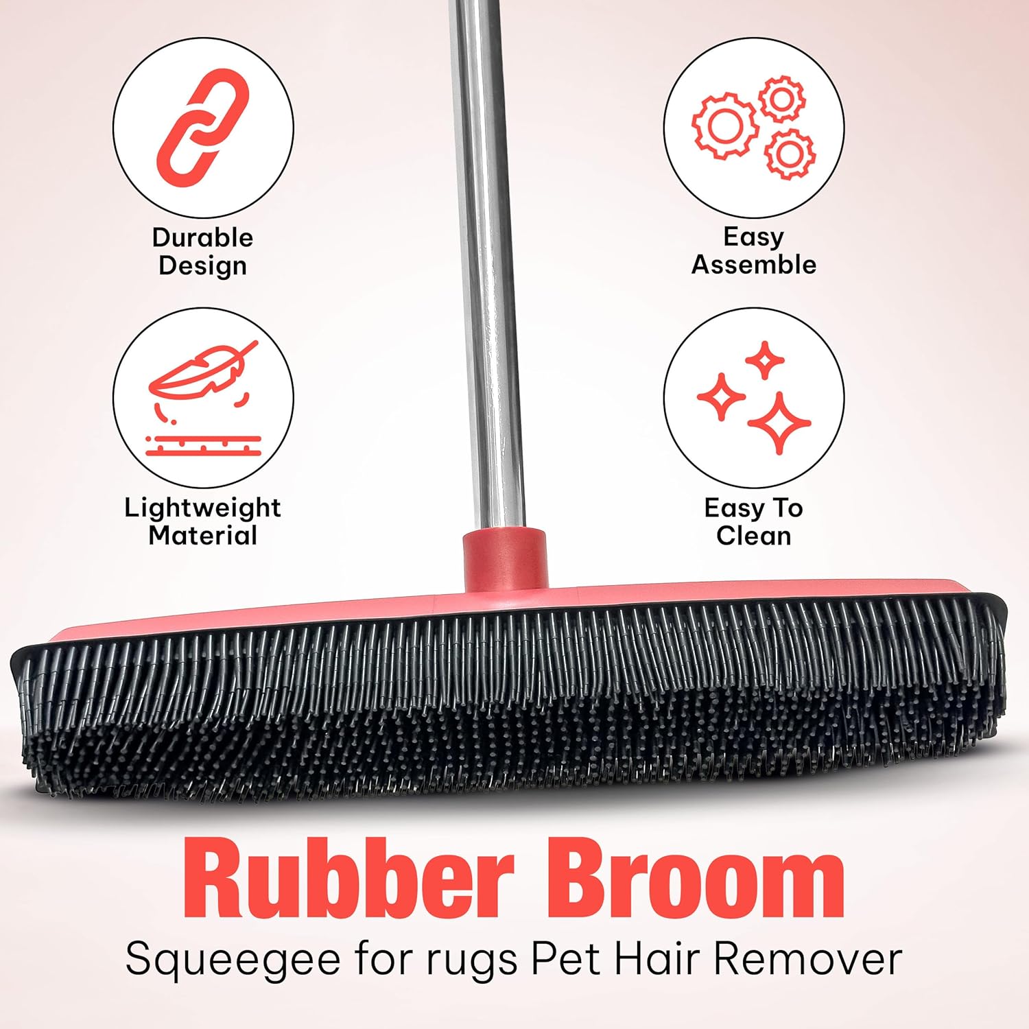 - 2-in-1 Rubber Broom & Squeegee: Designed for pet owners, our dog pet hair broom for carpet features soft, non-scratch rubber bristles and a built-in squeegee, ideal for cleaning up pet messes, liquid spills, and debris on smooth surfaces like windows, showers, and tiles