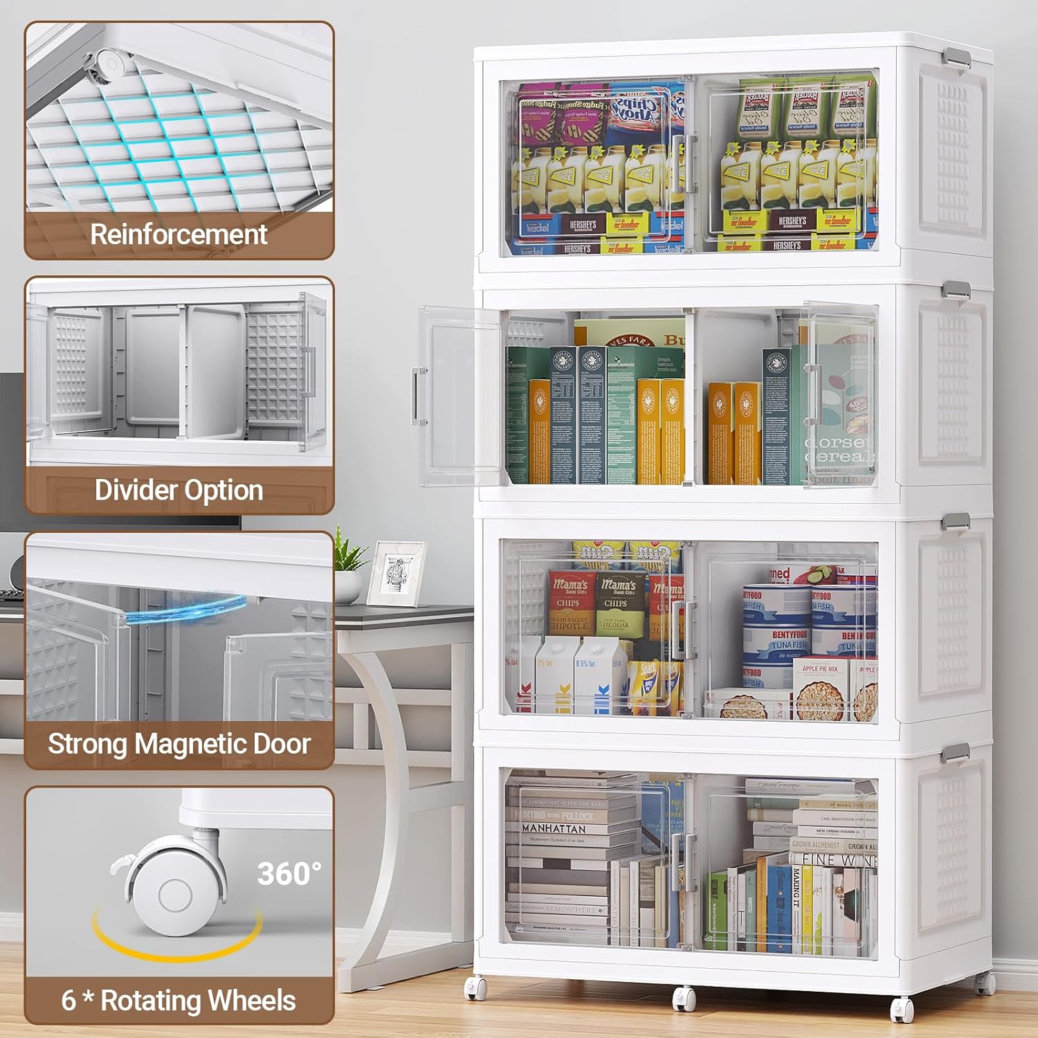 BROVIEW 800 Qt Plastic Storage Bins with Lid, Doors & Wheels, 4Pack Extra Large Stackable Collapsible Storage Bins, Closet Organizers and Storage Drawer, Foldable Cabinets for Home Office, White