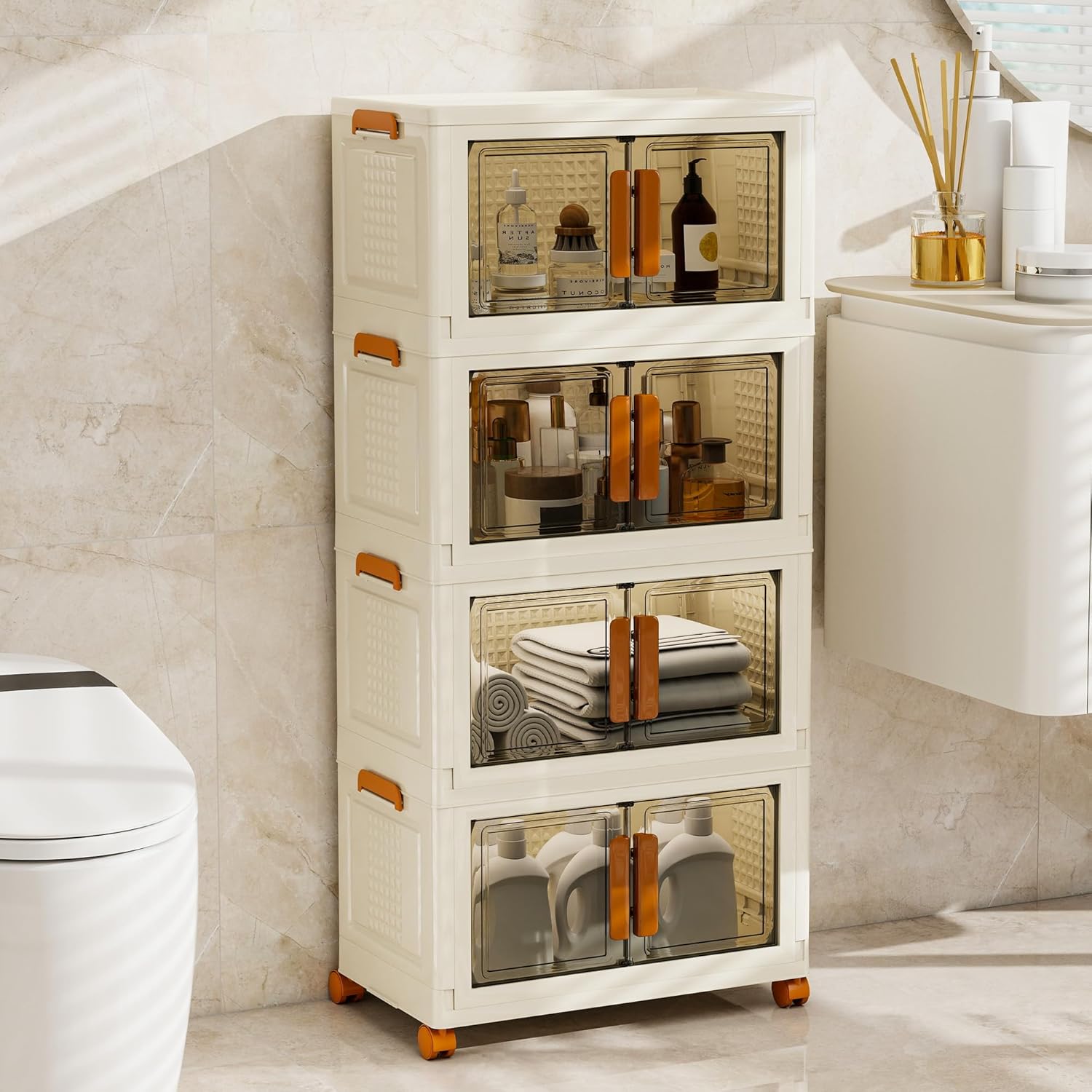 4 Tier Stackable Plastic Storage Bins with 1 Lid 45 QT/Tier, Collapsible Plastic Box Storage Bin with Wheels, Home Containers Boxes Closet Organizers for Living Room, Office, Dorm