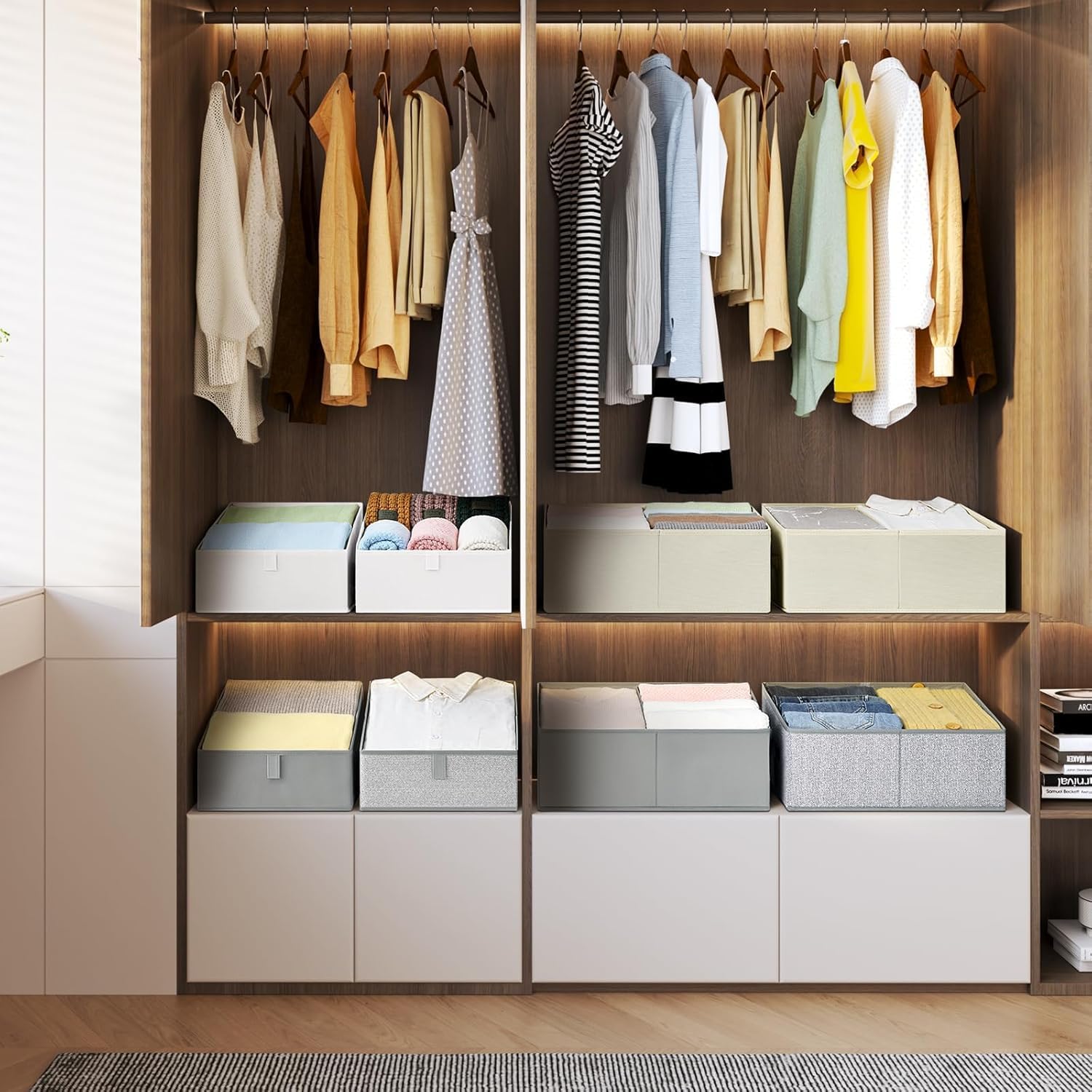 - 【Trapezoidal Design】These storage cubes are Trapezoid design that makes finding things convenient, also allows easy access when putting on the highest shelf. These are ideal closet bins for clothes, bags, shoes, towels, blankets, toys, dolls, and more
