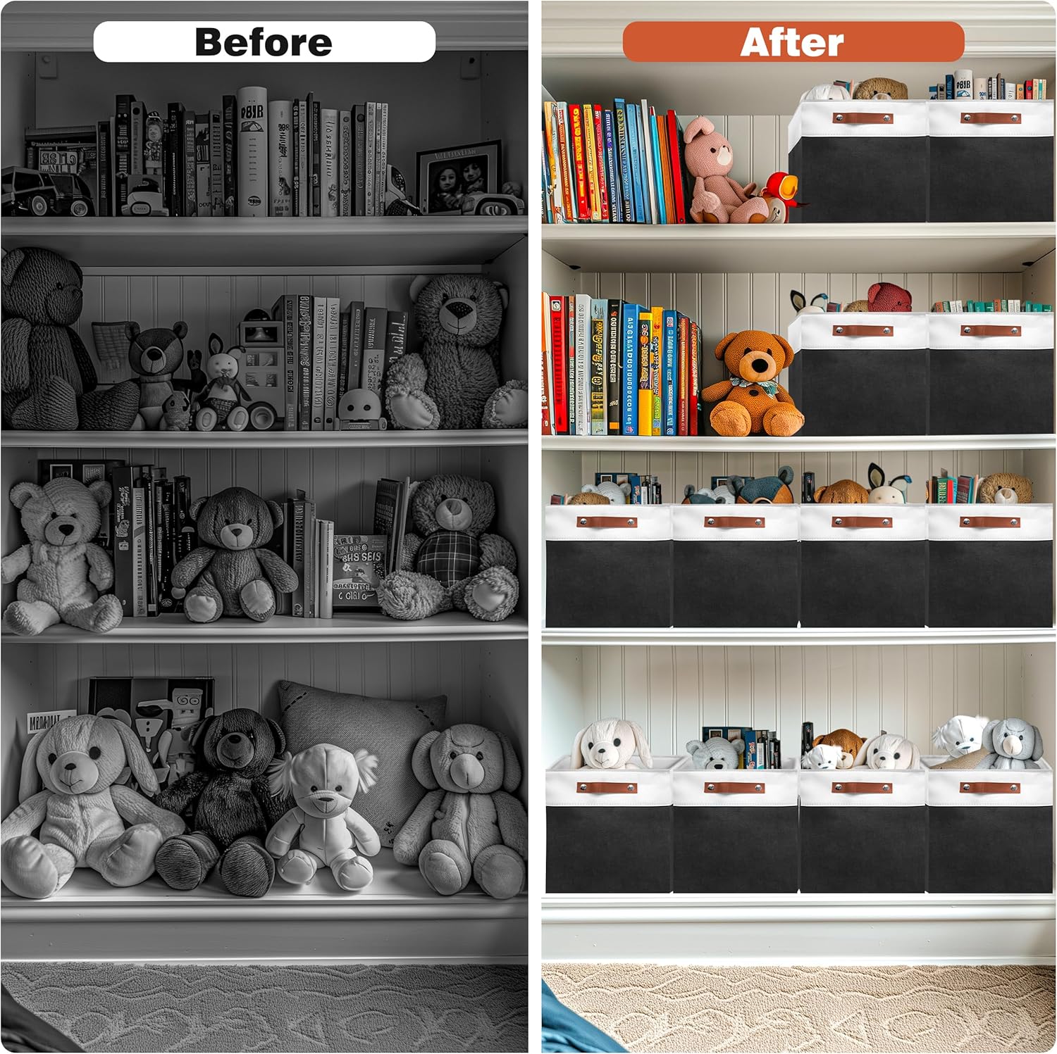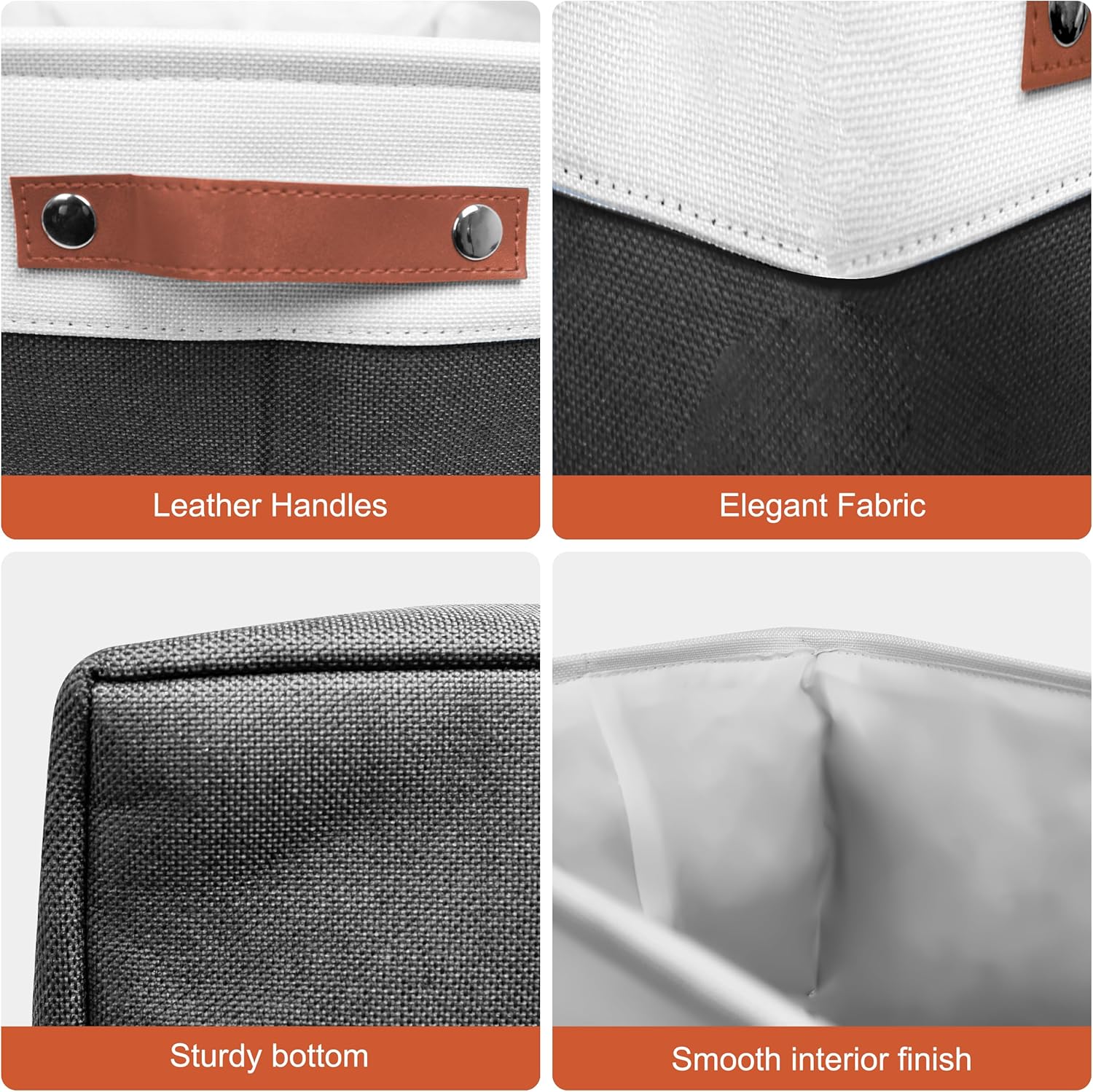 13in Open Fabric Storage Basket with Leather Handles for Organizing, Collapsible Linen Closet Bins for Shelves, Closets, Laundry, Decorative Basket for Gifts. (White&Black, 2PCS/13x13in)
