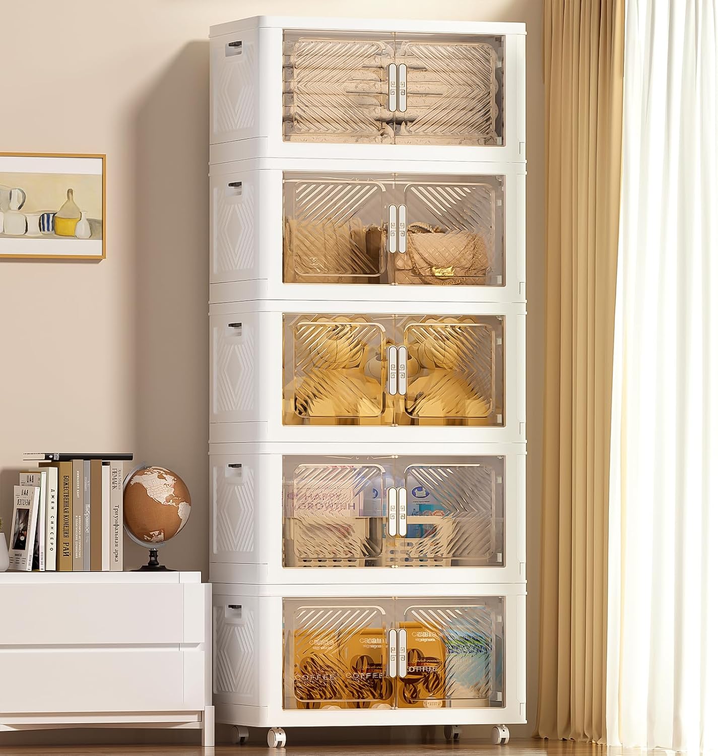 Storage Bins with Lid 76QT, Stackable Storage Containers with Wheels and Magnetic Doors, Plastic Clothes Closet Organizers and Storage Box for Pantry, Home and Office (5 Pack)