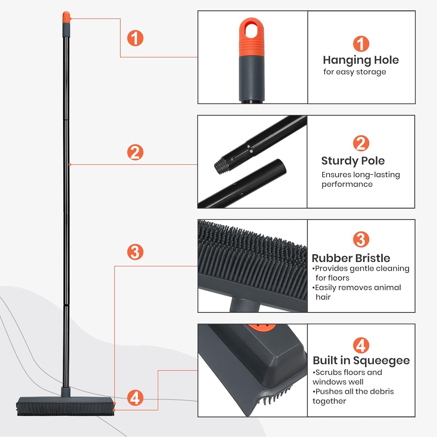 - 【2 in 1 Pet Hair Removal Broom】 Comes with rubber broom with built in squeegee, microfiber cloth, and cleaning brush. Carpet brush effectively get the stubborn hair out the rug, microfiber cloth wipe the floor, and the cleaning brush to remove hair and debris from the rubber bristles. This rubber broom set offer multiple functions in one tool, a must have for any home.