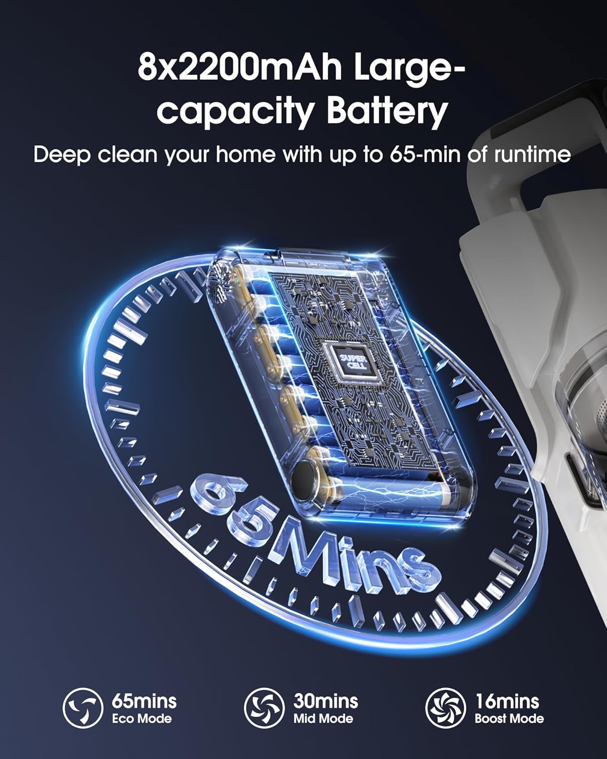 • Extended Runtime for Big Jobs – With fast charging, it fully recharges in ONLY 2.5 hours(Charger Included). Its upgraded 176,000mAh 8-cell battery delivers up to 65 minutes of continuous cleaning in ECO mode, reducing mid-task interruptions so you can cover more ground with fewer breaks.