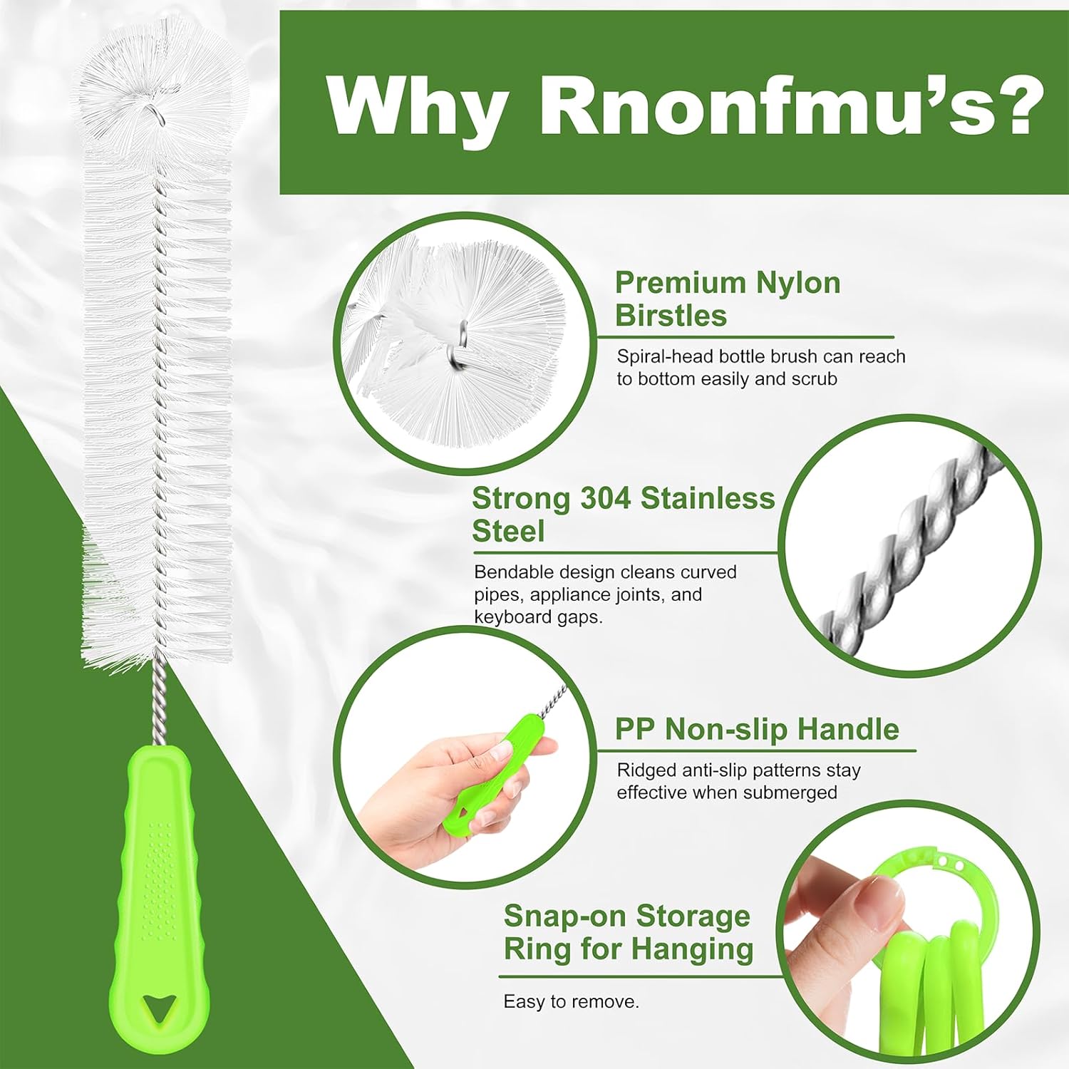 - Gentle Yet Effective Brush Kits: Rnoafmu bottle cleaning brushes includes 14 in large bottle brush (50mm width), 13 in ultra-slim straw brush (10mm width), 5 in(10-25mm) tapered lid brush and a storage ring. Perfect combo for tumblers, baby bottles, sports water bottles and hard-to-reach areas.