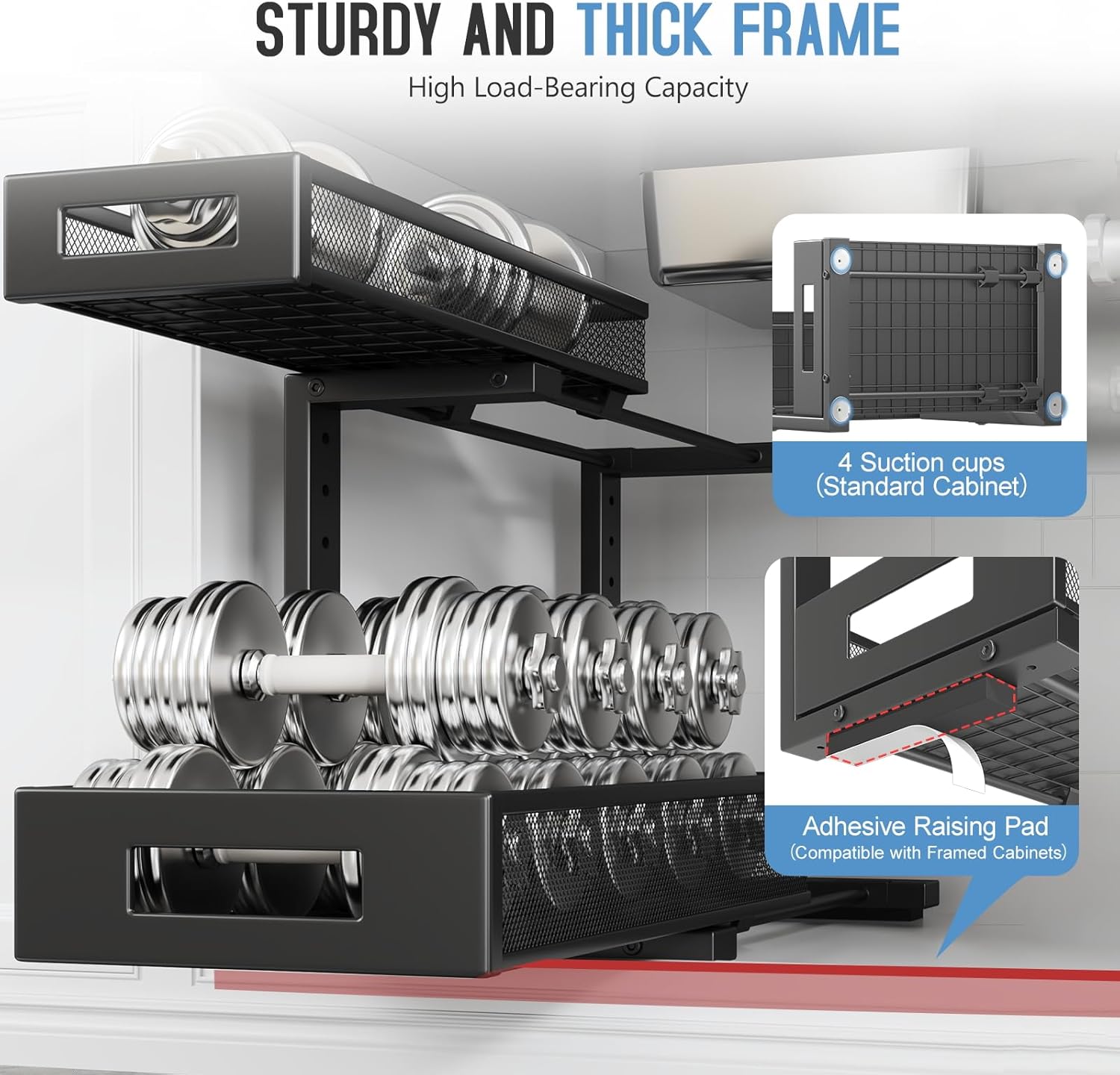 • 【2-Tier Pull-Out Design for Easy Access】This under-sink organizer features a double-layer pull-out design, allowing you to easily access items at the deepest part. The upgraded, thickened iron circular sliding rails ensure a smooth and seamless pulling experience, making each use effortless. The unique pull-out locking mechanism effectively prevents the drawers from being completely pulled out, avoiding the risk of items falling or structural damage caused by over-pulling, ensuring safer and more convenient use.