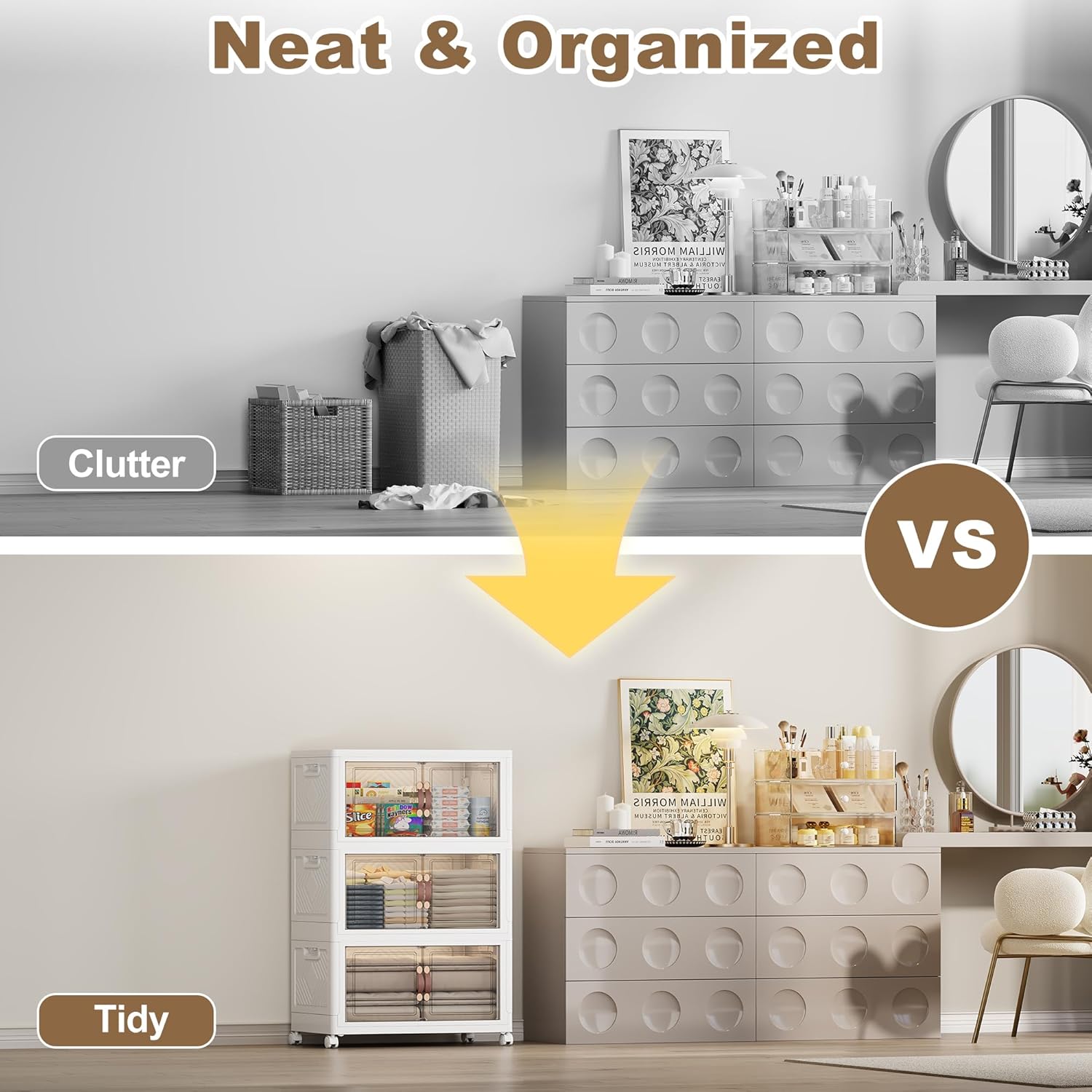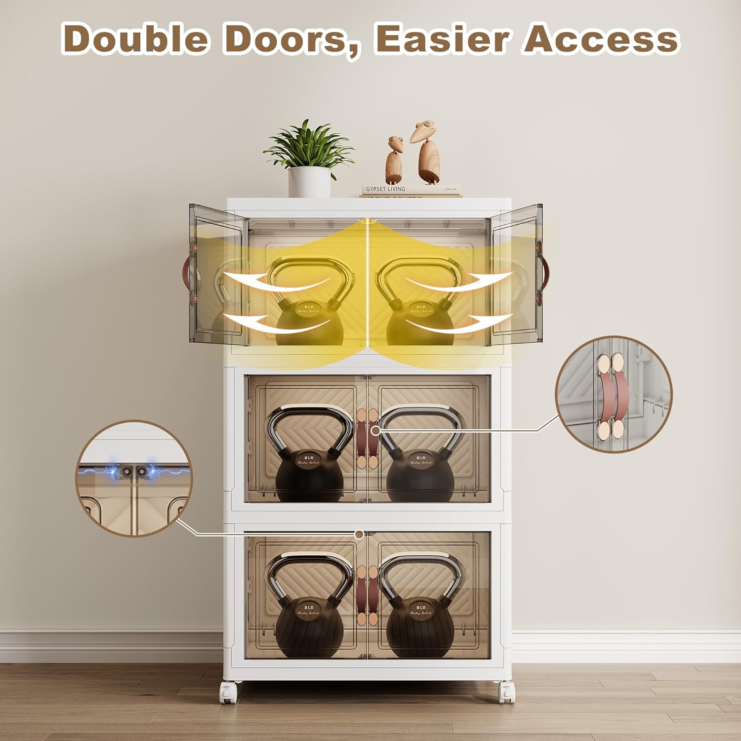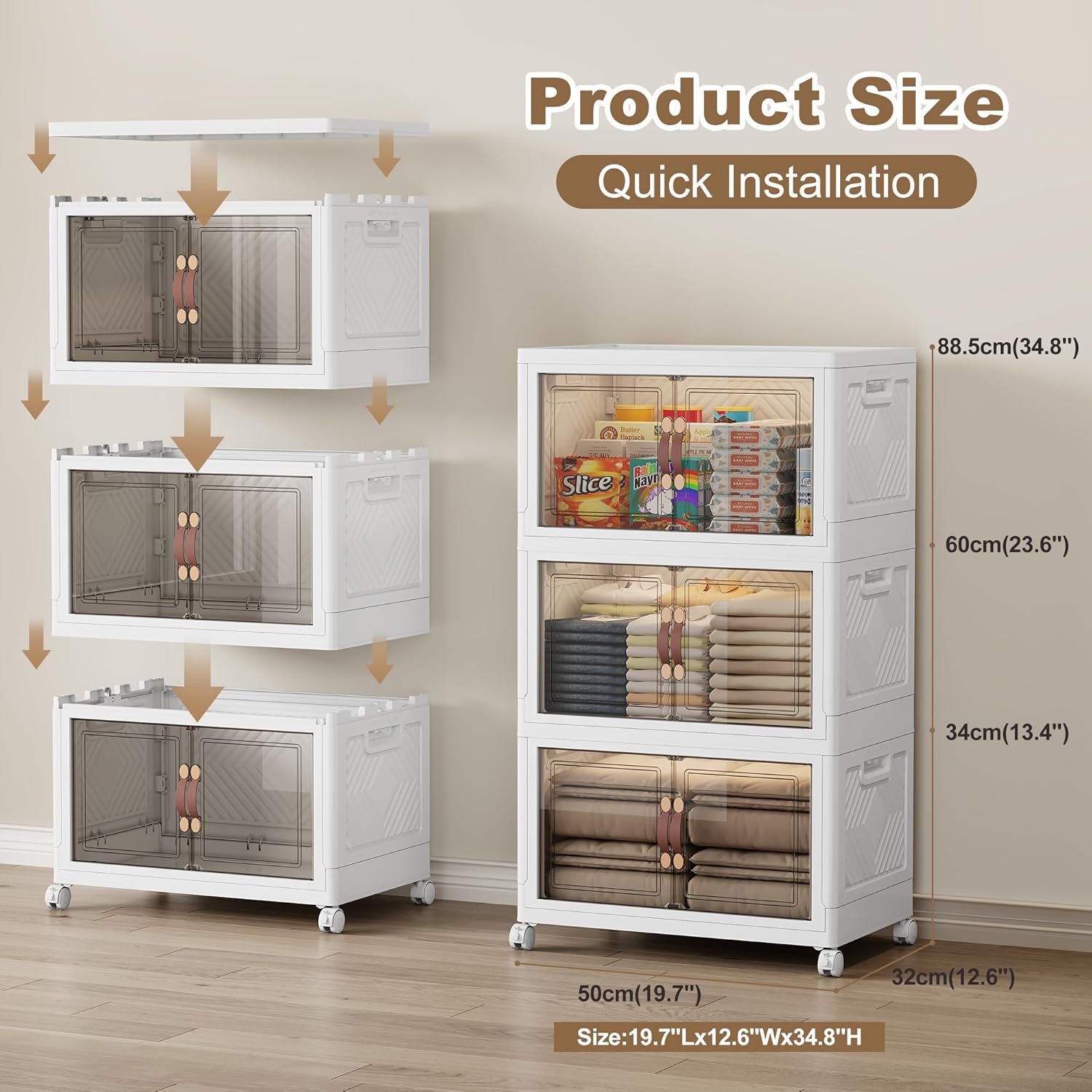 - 【Dual Access Design】:You can choose between a front door with a magnetic latch handle (for regular small items) or an overhead door (for accessing bulky items such as blankets, luggage or holiday decorations). The magnetic door design ensures that nothing falls out and opens smoothly. Large stackable storage bins stores more items.