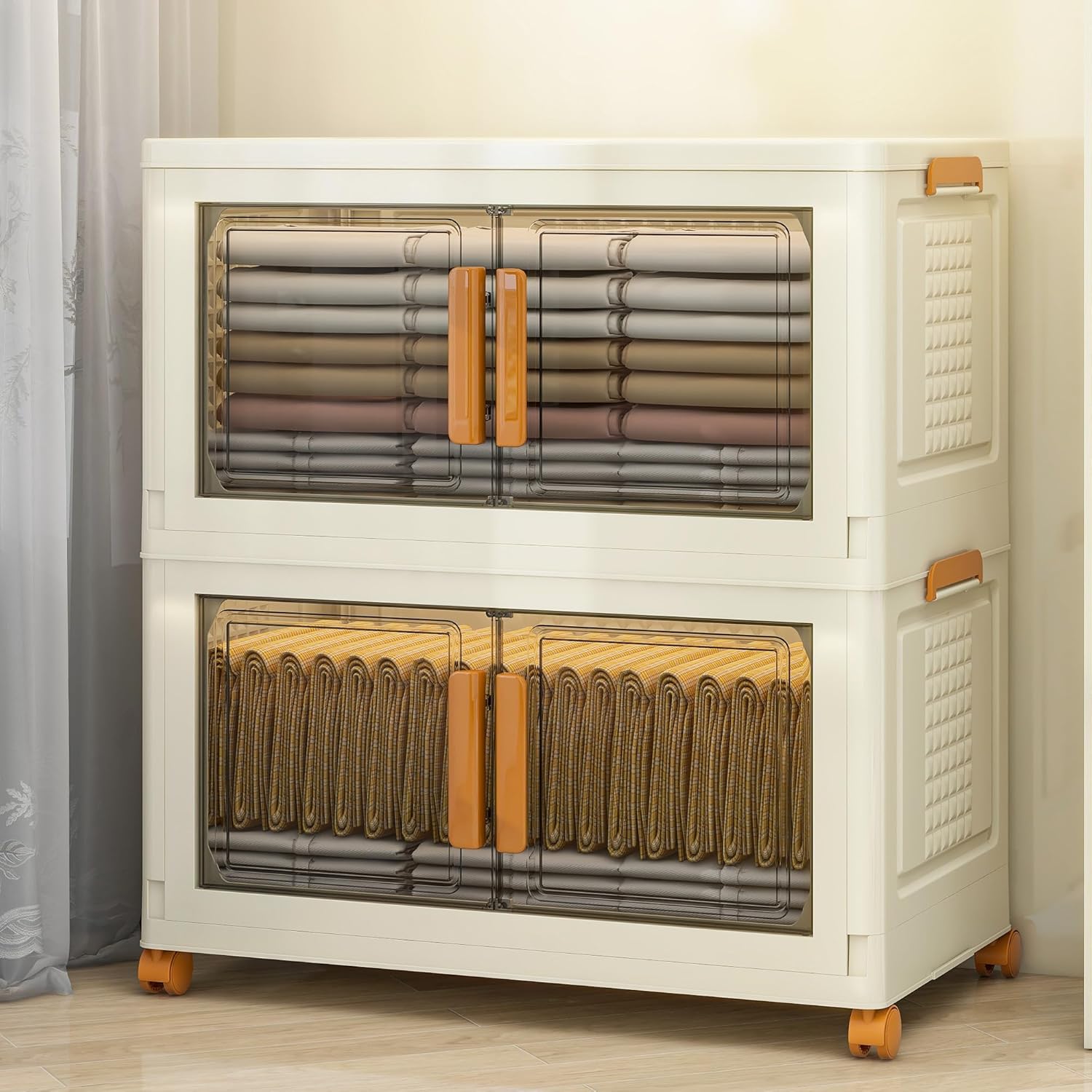 2 Tier Extra Large Stackable Storage Bins with 1 Lid 205 QT/Tier, Collapsible Plastic Box Storage with Wheels, Home Containers Boxes Closet Organizers for Living Room, Office, Dorm
