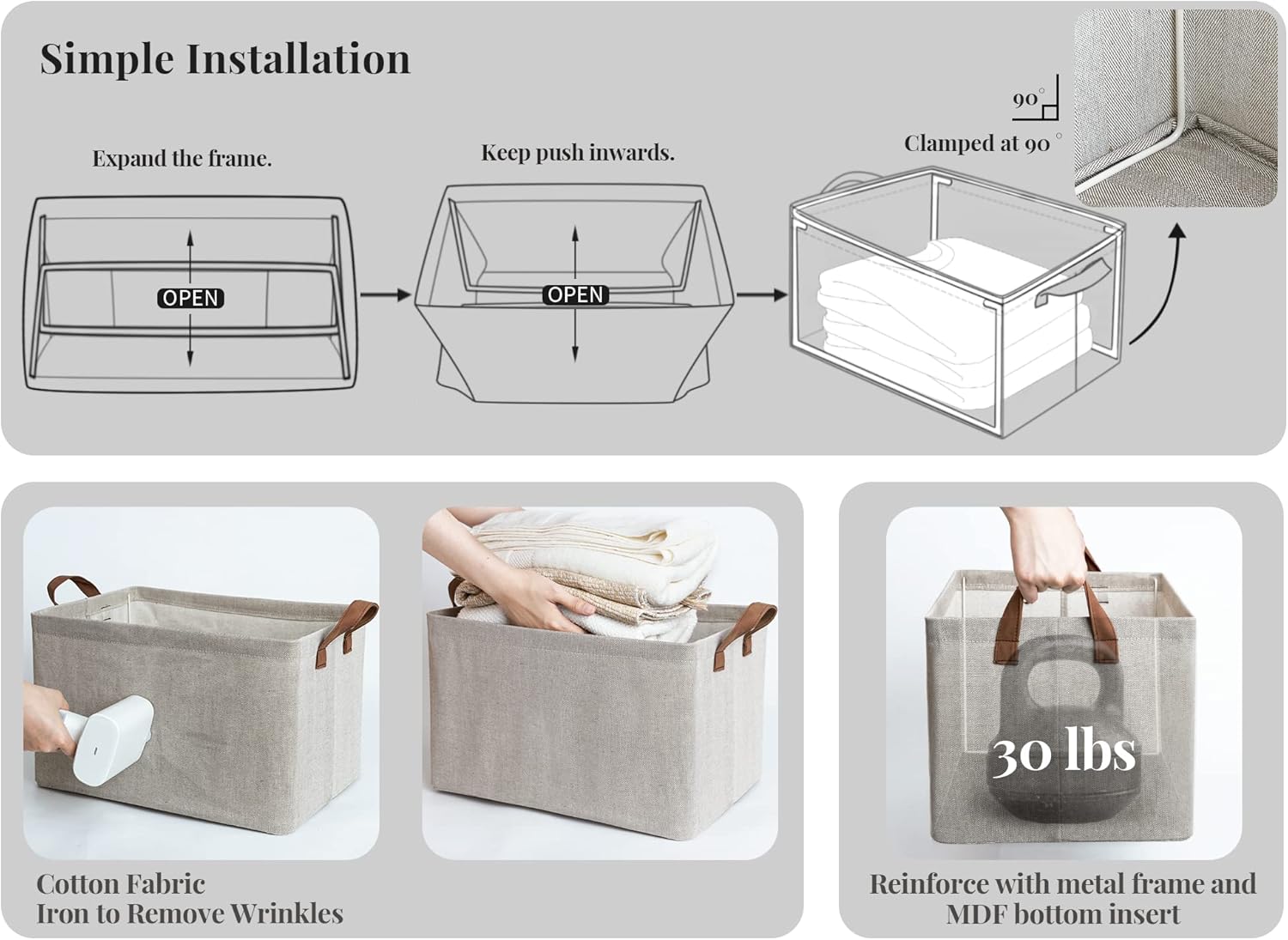 - Rectangle organizer basket with a heavy-duty bottom board and metal frame can support a weight of up to 30 pounds.