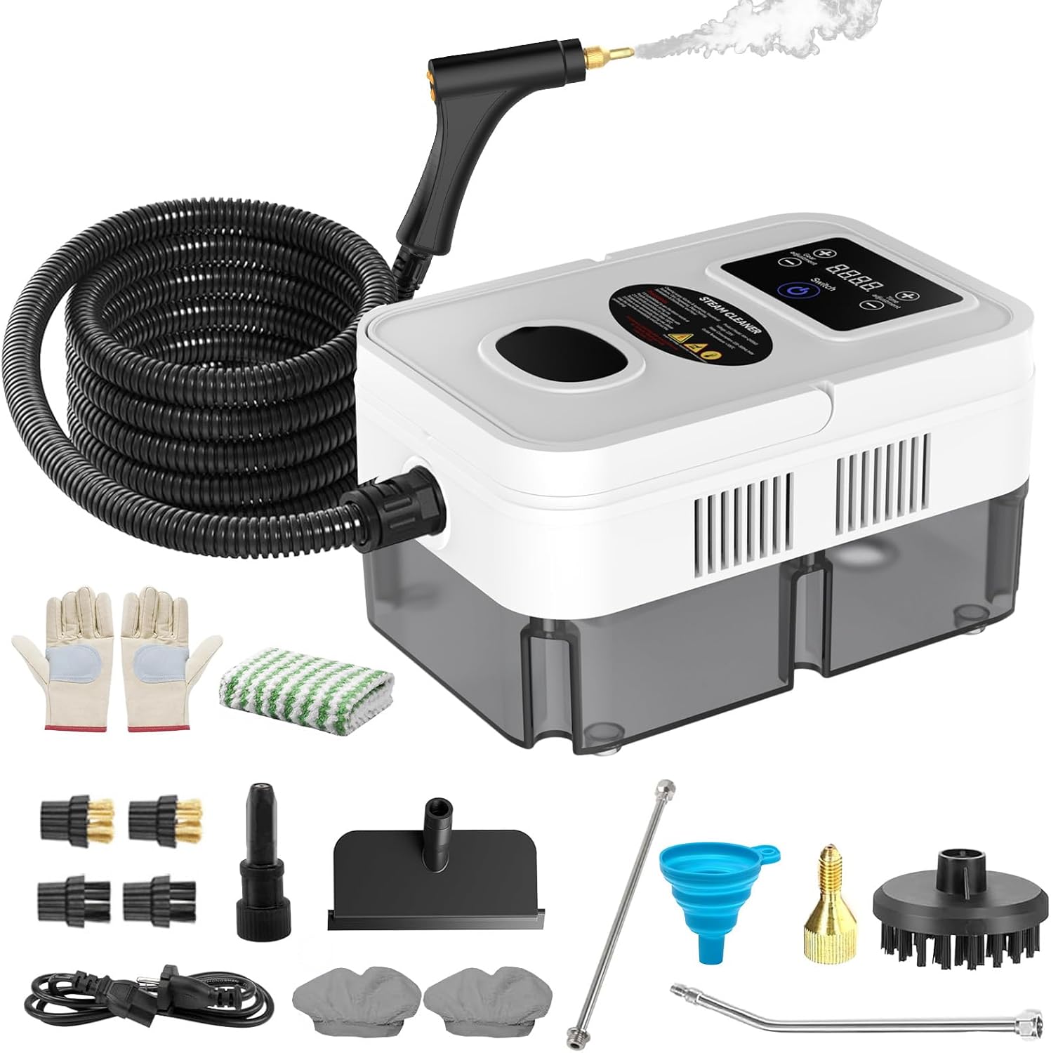 - 【Professional-Grade Steam Cleaner—Fast Heating with Smart Safety Features】 With 2500W of power, this steamer heats up in just 10 seconds and delivers high-pressure 221°F (105°C) steam to deep clean everything from floors to kitchen grease—no harsh chemicals needed. Set the built-in 30-minute timer for focused cleaning sessions, and don’t worry—it automatically shuts off if water runs low or time’s up
