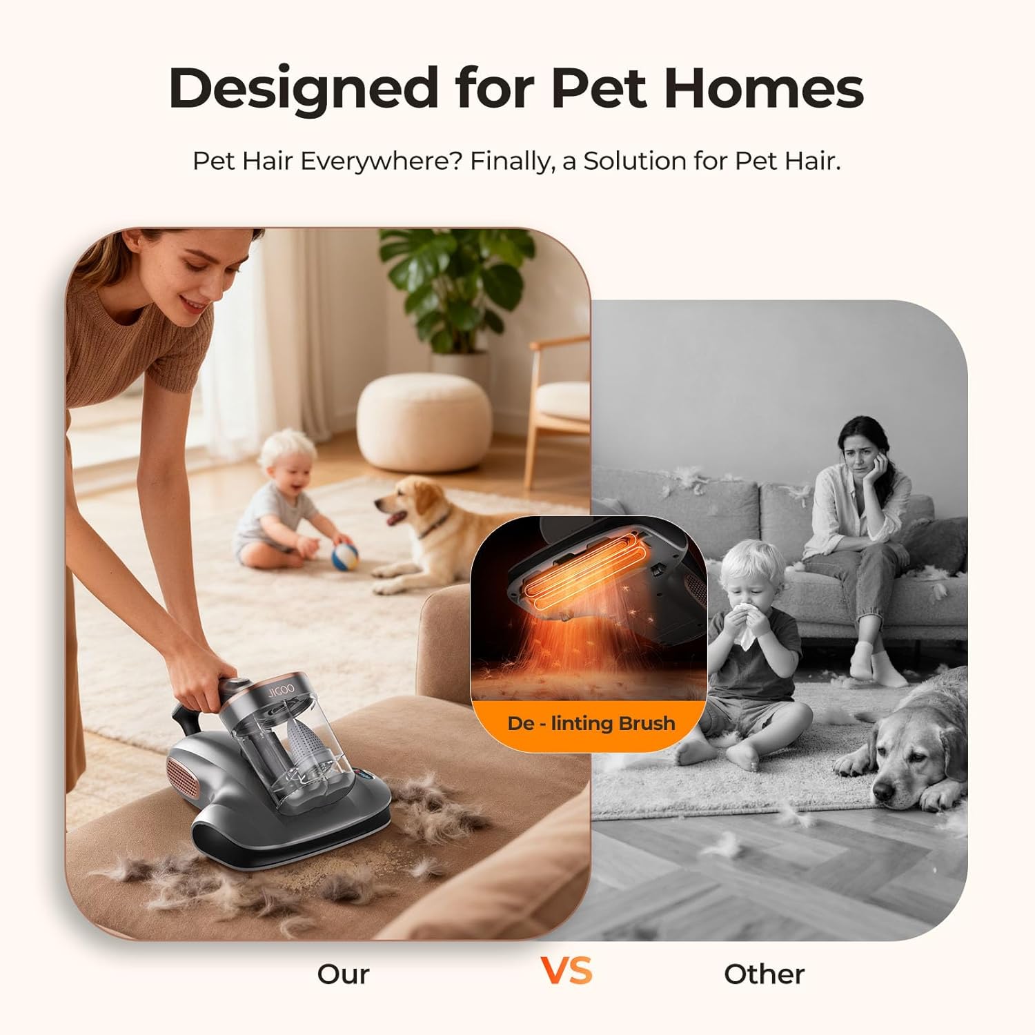 - ăPowerful Suction & High-Frequency TappingăDriven by a 150W brushless dual-motor system, our cordless bed vacuum cleaner delivers 10KPa suction power and 80,000 high-frequency taps per minuteâover twice the speed of other vacuum cleaners. The ultra-long tapping bar and dual suction ports work together to effectively remove deeply embedded particles and residues from fabrics, covering 30% more surface area per pass for thorough results.