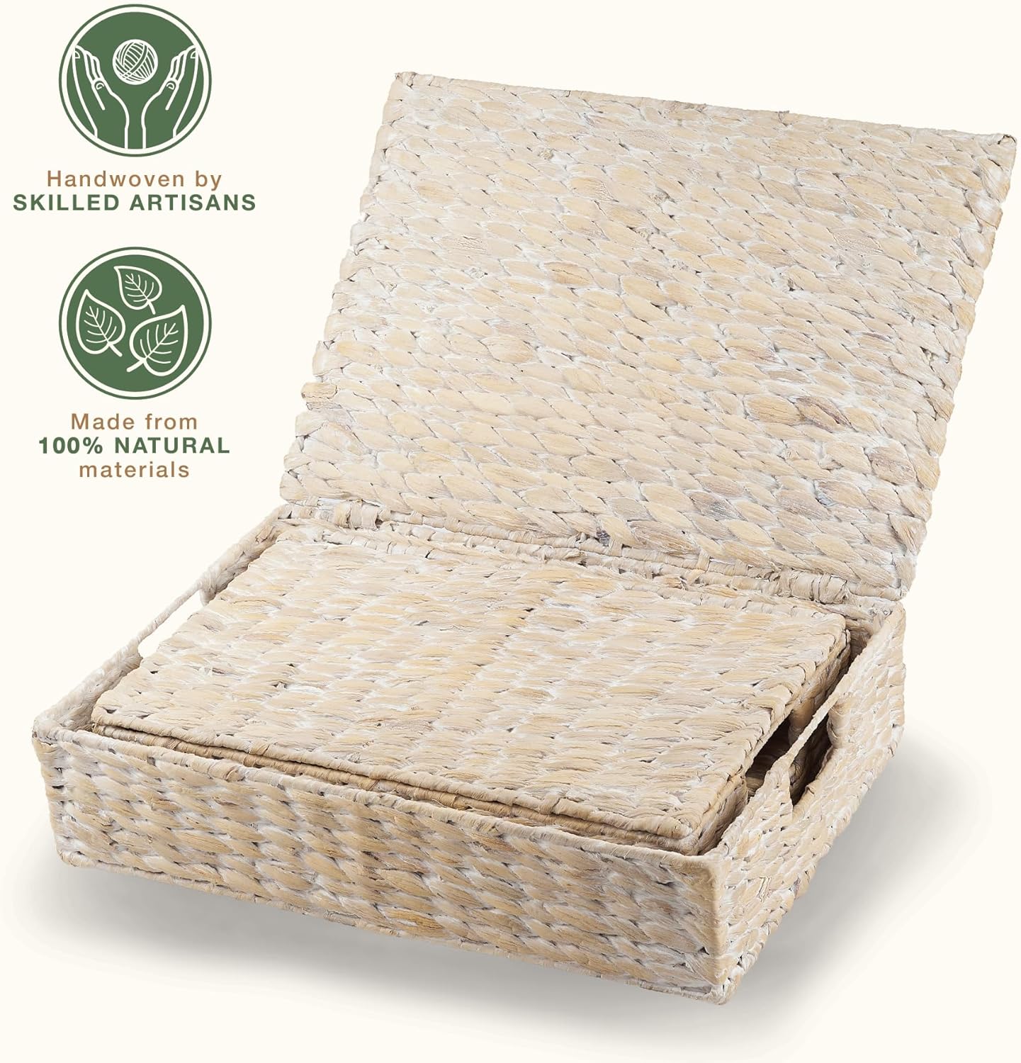 - Artisanal Quality: Experience the unmatched quality of our seagrass baskets. Each piece is meticulously handwoven with 100% natural water hyacinth by skilled artisans, ensuring a unique and beautifully crafted storage solution for your home.