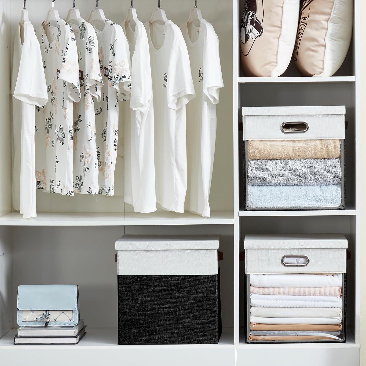 - Foldable design: Roobyl linen closet organizers and storage features a foldable design that allows the box to be folded and placed in a closet or mezzanine when not in use, perfect for storage when changing seasons. Portable clear storage cube saves space in a closet or a mezzanine, maximizing the use of space, and the non-removable cardboard is designed to be more convenient, avoiding the loss of the box when not in use due to the removal of the cardboard and separation from the organizer.