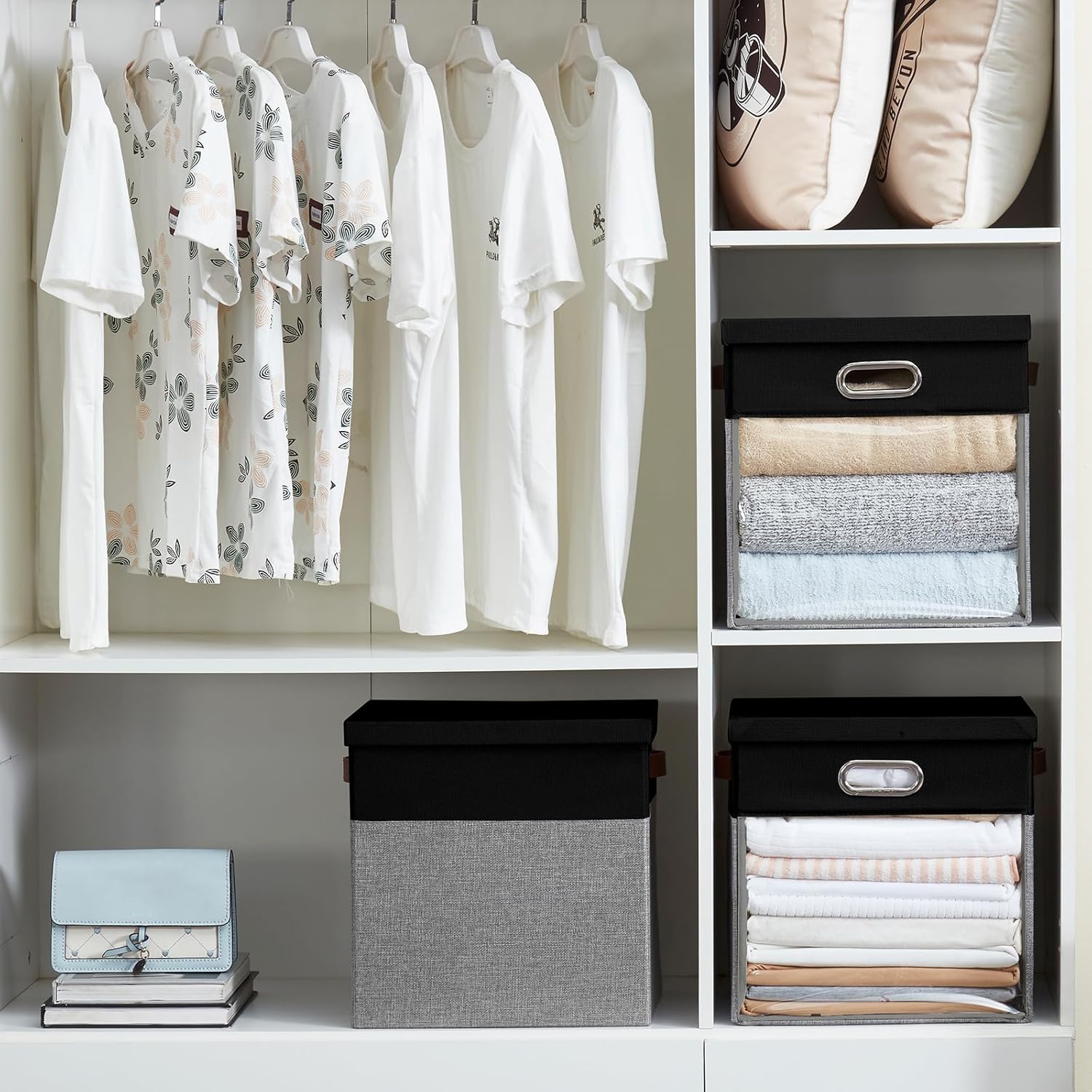 - Foldable Design: Roobyl linen closet organizers and storage features a foldable design that allows the box to be folded and placed in a closet or mezzanine when not in use, perfect for storage when changing seasons. Portable clear storage cube saves space in a closet or a mezzanine, maximizing the use of space, and the non-removable cardboard is designed to be more convenient, avoiding the loss of the box when not in use due to the removal of the cardboard and separation from the organizer.