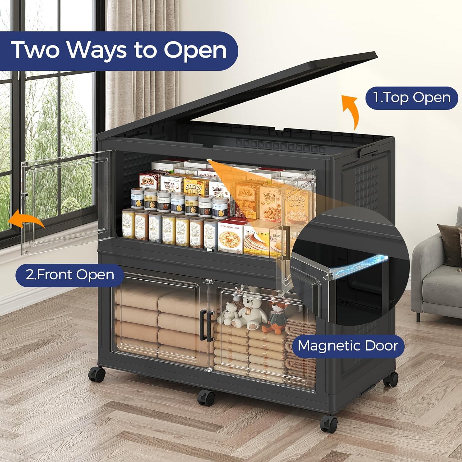 - 【Two Ways to Open & Clear Magnetic Doors】Fangtueh collapsible storage bins with lid and wheels feature a dual access way, allowing for both top and front door openings, and with clear windows for easy visibility. The stackable plastic storage bins with open front doors are equipped with magnetic lock buckles to prevent dust from entering the cabinet.