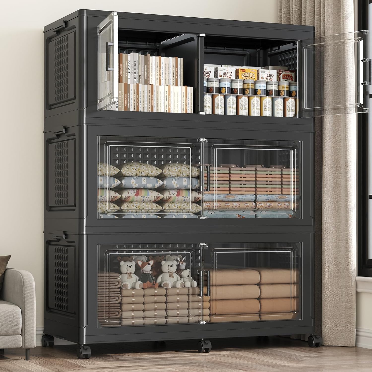 - 【Two Ways to Open & Clear Magnetic Doors】Fangtueh collapsible storage bins with lid and wheels feature a dual access way, allowing for both top and front door openings, and with clear windows for easy visibility. The stackable plastic storage bins with open front doors are equipped with magnetic lock buckles to prevent dust from entering the cabinet.