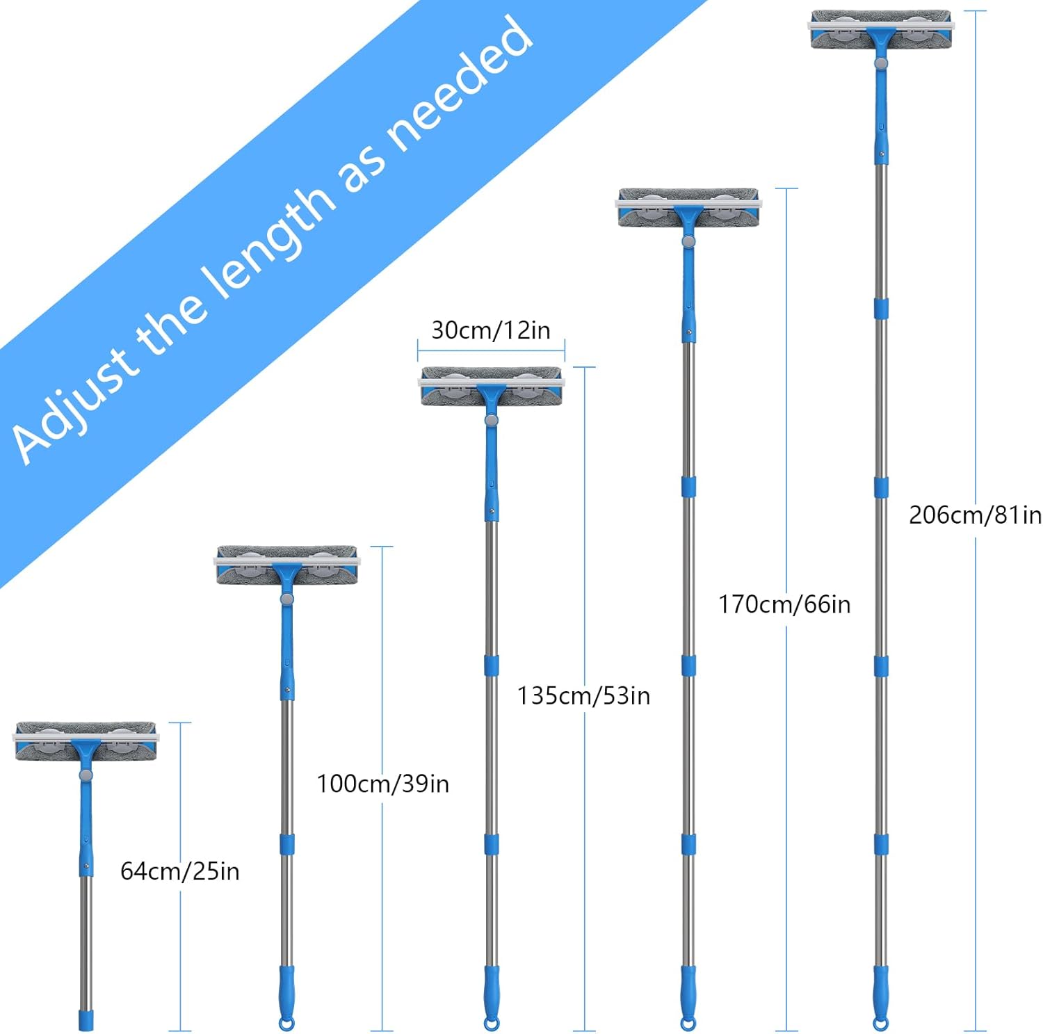 - What You Get: 1x 12'' window squeegee head, 5 sections of stainless steel pole 81’’, 2 spare microfiber scrubber cloth. Within 30 Days 100% money-back warranty for any problem, including product or service. 24/7 customer service, 12-month free replacement. If you are looking for a window squeegee that is not only premium quality but also reasonably priced, this is the right product for you.